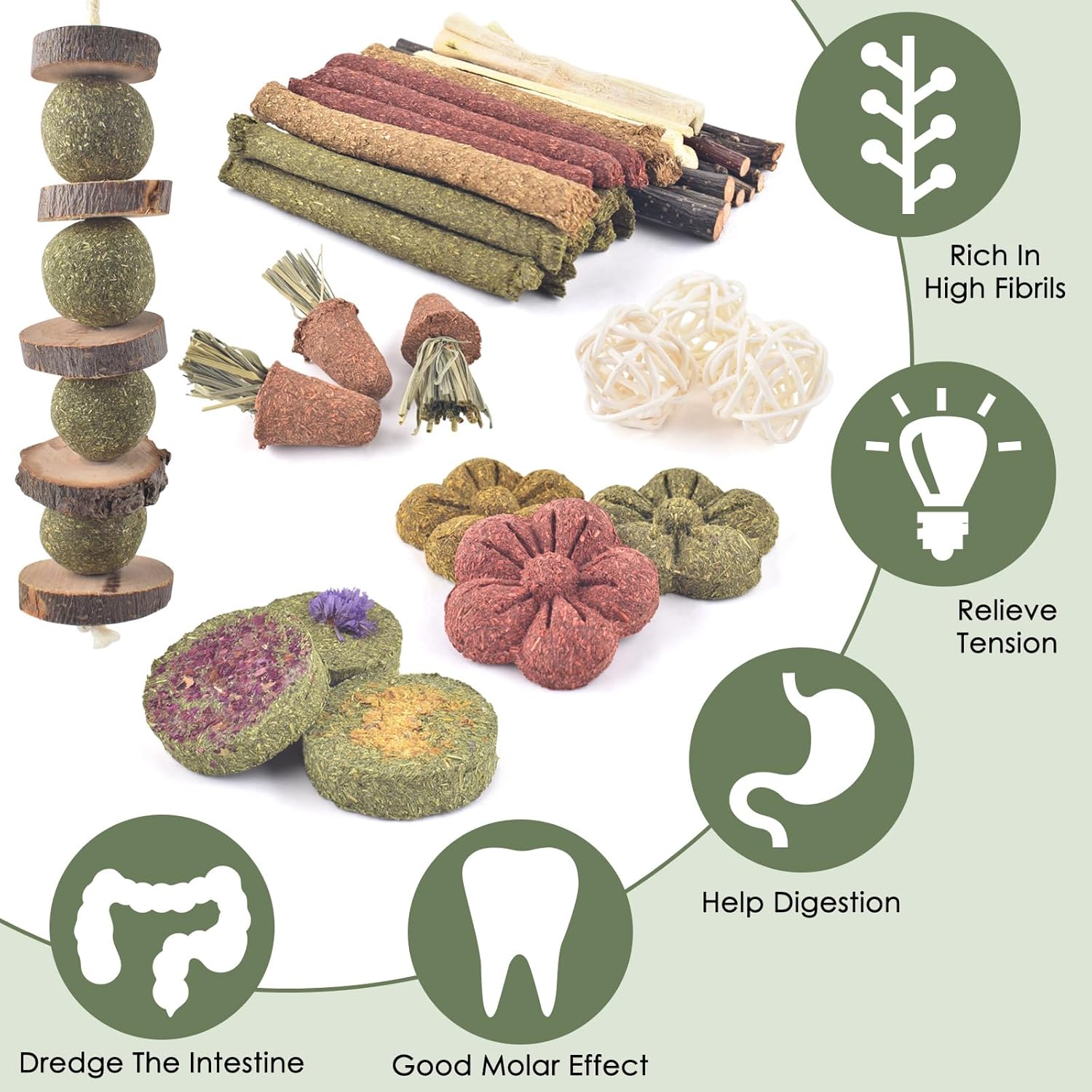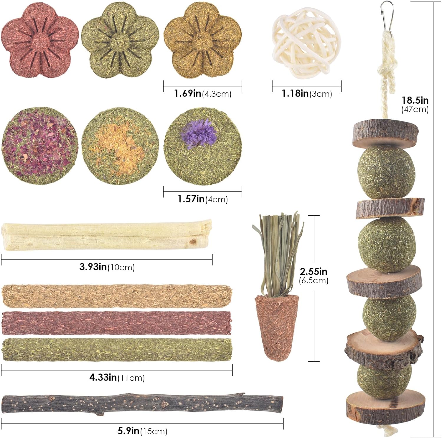 ERKOON Bunny Toys Boredom, 42 PCS Bunnies Timothy Hay Sticks Carrots Rose Grass Cake Dental Care, Molar, Chinchillas Toy Chew Toy, Guinea Pigs, Hamsters, Chinchilla, Rabbit Chew Toys for Teeth