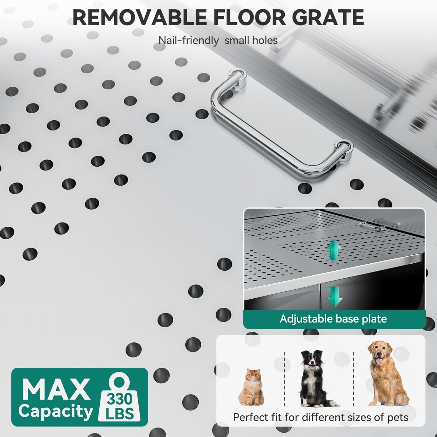 - Enhanced Drainage System: Our pet wash station is designed with a S-shaped drain pipe; The two-tier adjustable floor accommodates pets of all sizes, providing a complete and enjoyable bathing experience