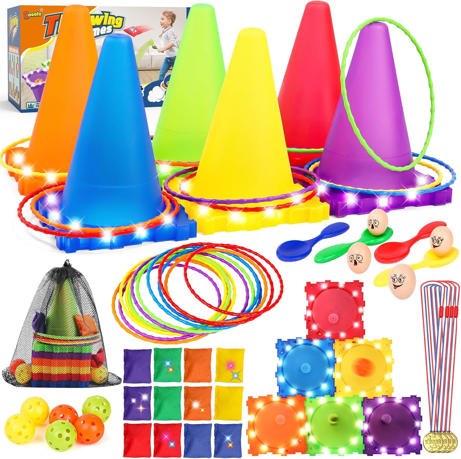 Eocolz 49PCS Carnival Games Outdoor Combo Set for Kids with LED Light, Plastic Cones Obstacle Course Bean Bags Balls Ring Toss Game Egg and Spoon Race Lawn Game, Gift for Birthday Party/Xmas/Easter