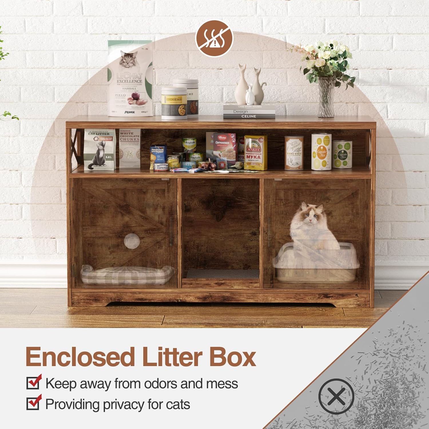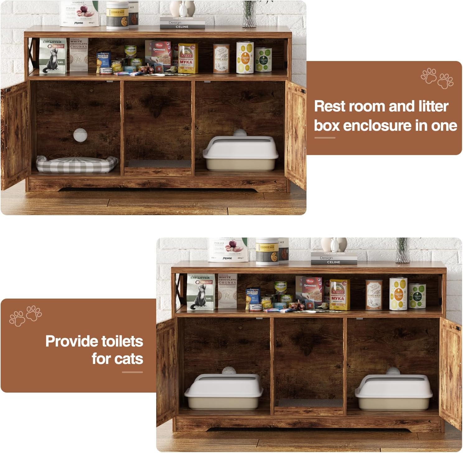- Double Cabinet for 2 Cats: The 2 cabinets hold litter boxes or cat beds for 2 cats. Or both for one cat: one side for a litter box, the other for a cat bed. Our multi-functional cat box enclosure is designed with a spacious countertop and open storage compartment, perfect for storing pet food, toys and home decor.