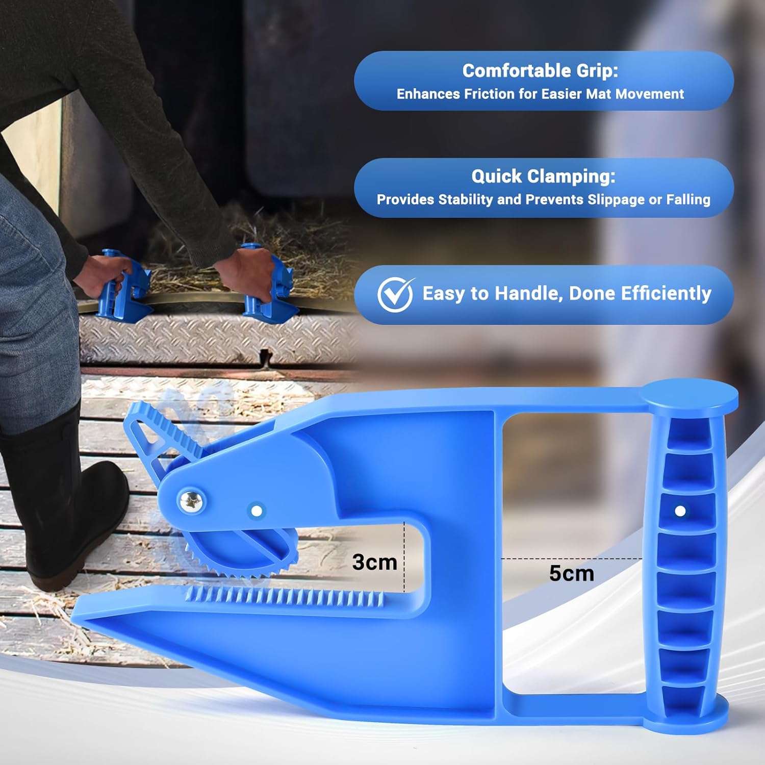 • [Multi-Scenario Use]You might need to move heavy mats like those at a barn, horse stall, trailer, or gym flooring. Specially designed clamps make it easier to handle these horse stall mats, helping you grab, move, or flip them for effective cleaning of debris and waste, boosting efficiency and safety.
