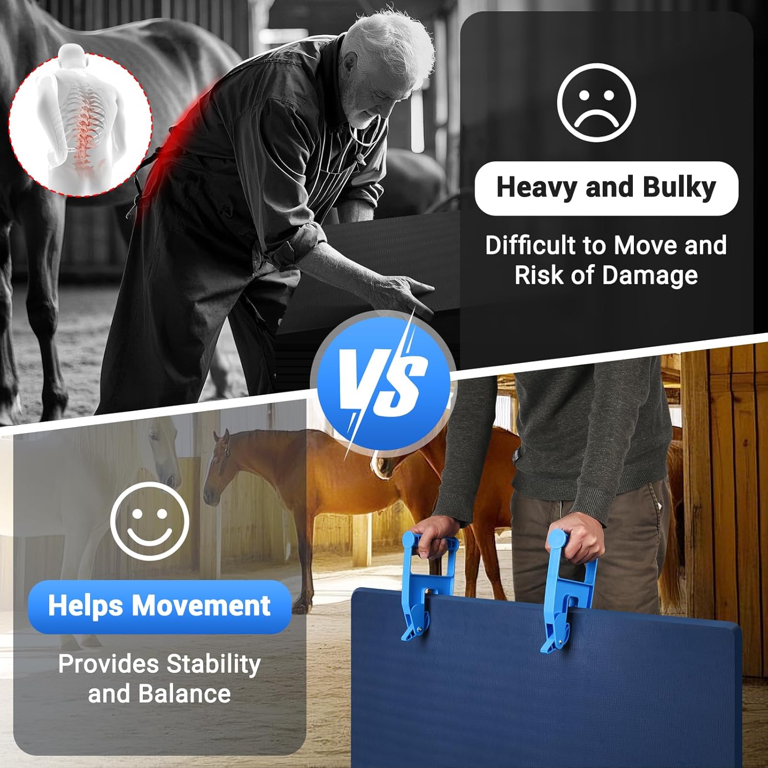 • [Pair of Stall Mat Mover Tool]This Stall Mat Handler is specifically designed for moving and adjusting horse mats. The Mat Gripper features clamps for easy lifting of mats, making transportation and storage convenient while eliminating the hassle of manual handling. This tool keeps mats clean and tidy, saving time on organizing and cleaning, and improving efficiency.