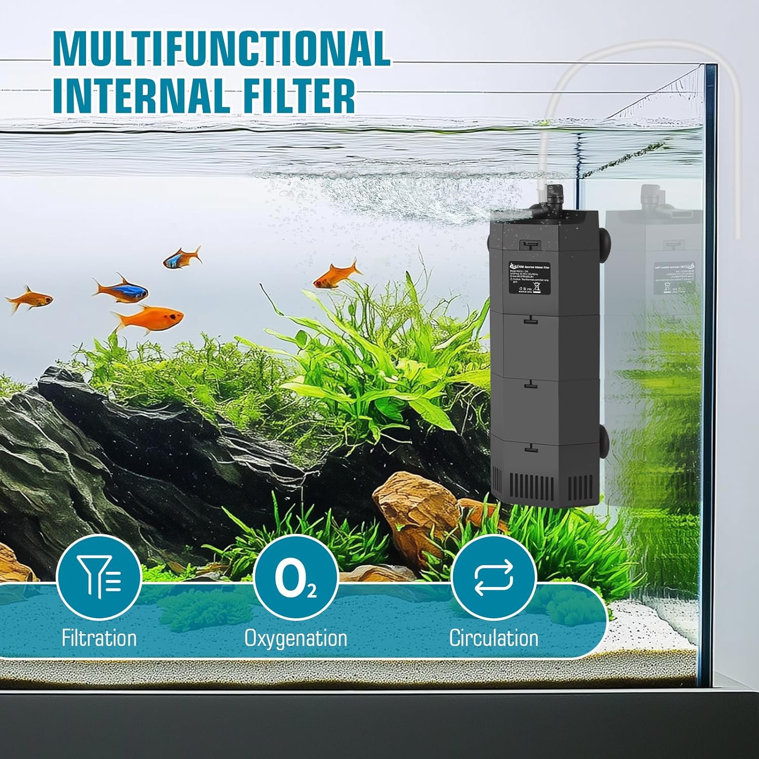 • Powerful Filter with Whisper Operation – Designed with low-noise technology for whisper-quiet performance, this submersible fish tank filter maintains a peaceful environment in bedrooms, offices, or living rooms without disturbing you or your fish.