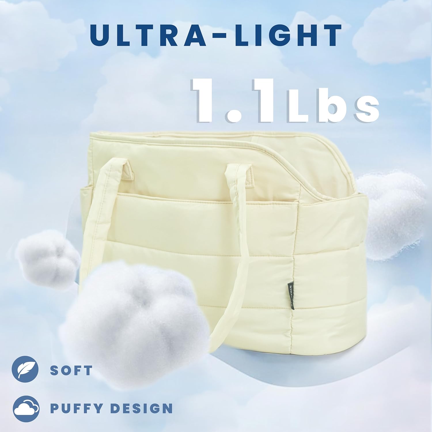 Lightweight Dog Purse Carrier for Small Dogs Under 15 lbs, Puffy Quilted Pet Carrier Tote for Puppies with Safety Leash Clip, Women's Hands-Free Dog Carrier Bag for Travel/Shopping (Beige)