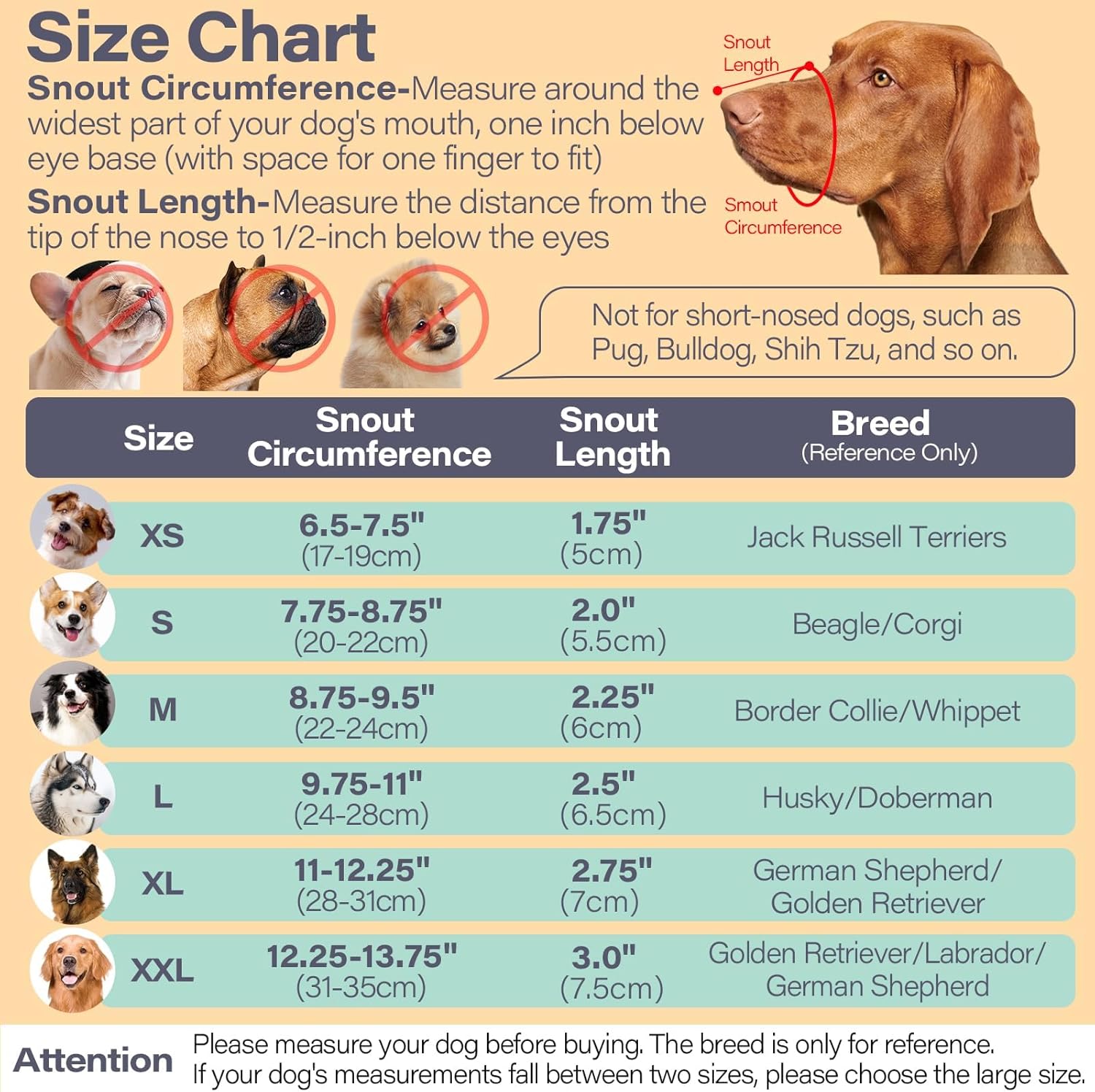- Size XXL (Cir: 12.25-13.75”, length: 3.25–4”) – This large dog muzzle fits Golden Retrievers, Labradors, German Shepherds, etc., but not for aggressive dogs, highly anxious dogs. Measure your dog's snout circumference and length per the size chart or video. If between sizes, SIZE UP! For dogs with longer snouts like Dobermans, choose based on both snout circumference and length. Ensure the muzzle fits comfortably, with the nose not touching the edge