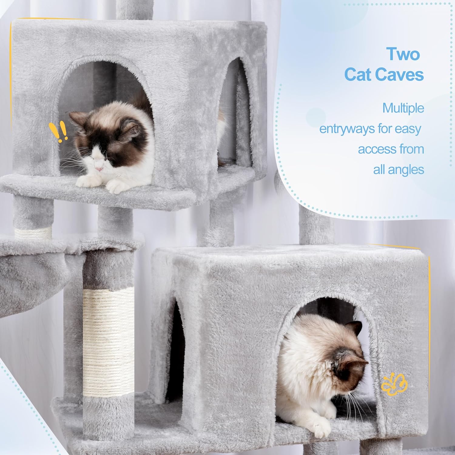• 2 Roomy Cat Condos: Creating dual relaxation spaces for the cat tower. while the semi-private hideaway satisfies kittens' instinctual need for secure napping spots