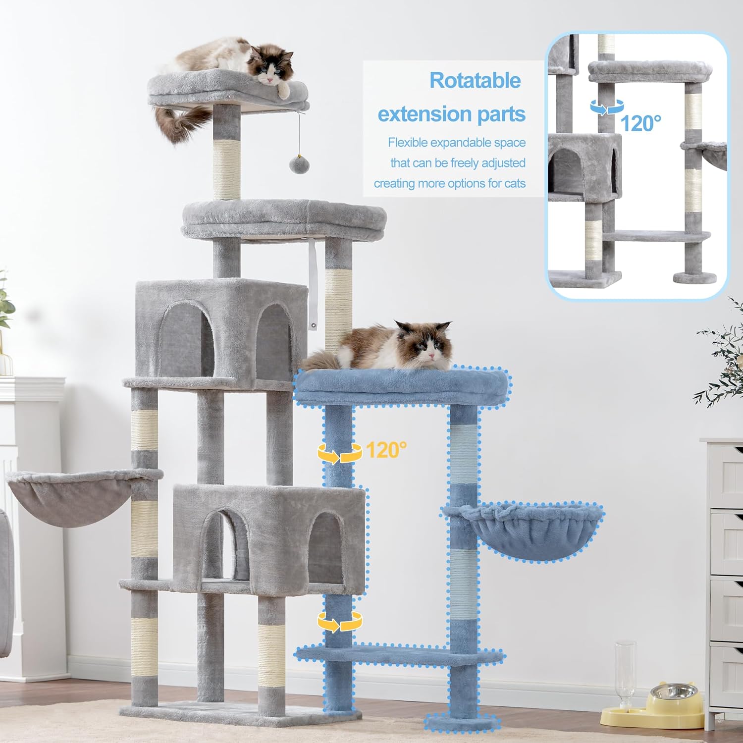 • Rotatable Extended Part: This cat tree has an additional extended part, which provides more space for cats to climb and rest. The part can be rotated at multiple angles, enabling the furniture can adapt to different spaces and offer more stable support for the cat tree tower