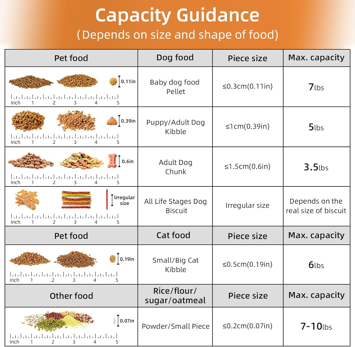 - CAPACITY : Pet dry food storage containers (size and size combination)-our cat food storage container combination capacity is 12 LBS(large pet container is 5-7LBS,small rice container is 3-5LBS) and can hold approximately 10-15 pounds of pet food.It also works well with regular kitchen food.Such as rice,flour,cereal,beans,nuts,snacks or whatever you like