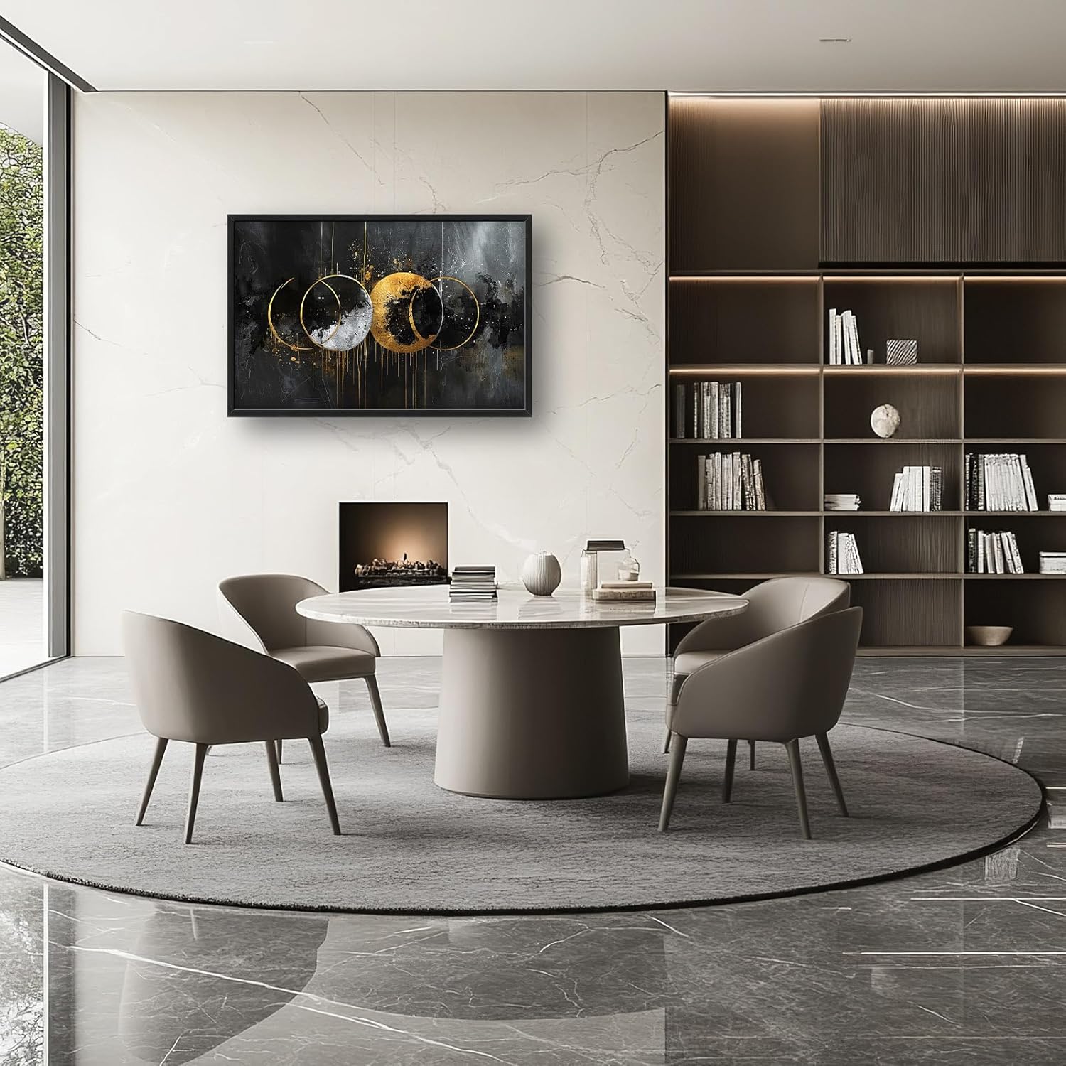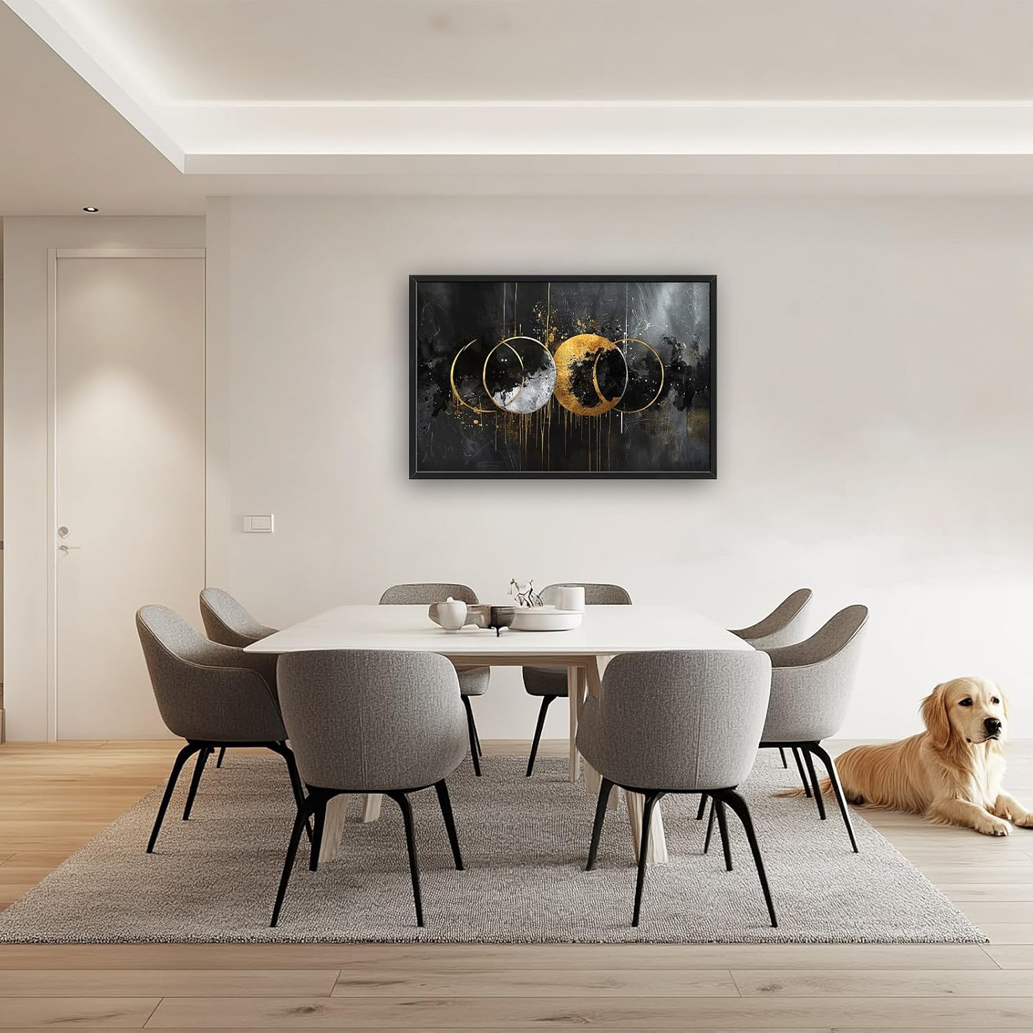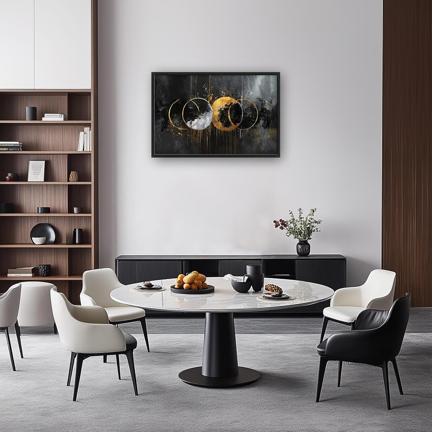 - 【Unique Design】A digital painting of four circles painted in black and gold on an abstract background, the smooth lines can be seen as the movement between the moon and the sun. The composition is balanced and vibrant.