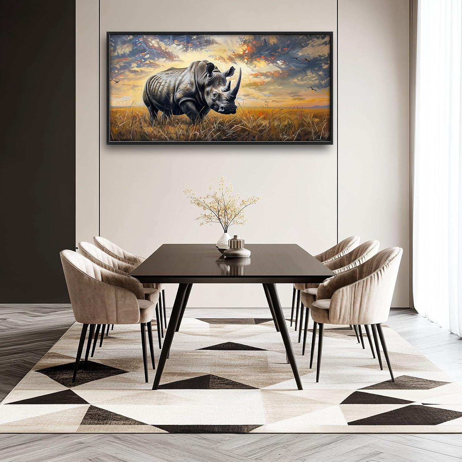 - 【Unique Design】A majestic rhinoceros stands tall in the savannah, with its powerful horns and thick skin, against a backdrop of golden grasslands under a dramatic sky. The painting captures the essence of wildlife beauty, emphasizing details like intricate fur patterns on its body and expressive facial features.
