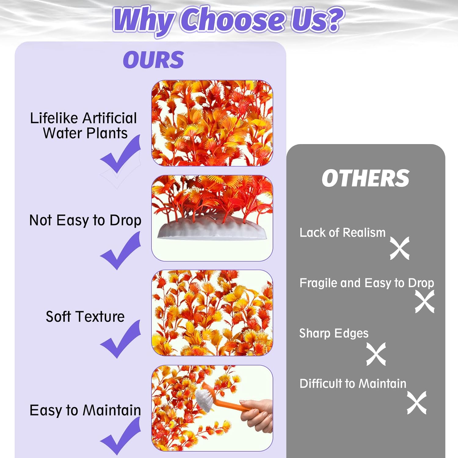 • RELIABLE MATERIAL : Our fake water plant leaves and roots are made of soft plastic material that won't affect the water quality. The leaves do not have sharp edges and have a soft texture, which can effectively avoid any physical damage to the fish while swimming or playing, and can better beautify the e-nvironment, maintain stability and not fade. Provide a comfortable and clean living e-nvironment for fish. Whether placed in a saltwater e-nvironment or freshwater e-nvironment, it can be perfectly adapted