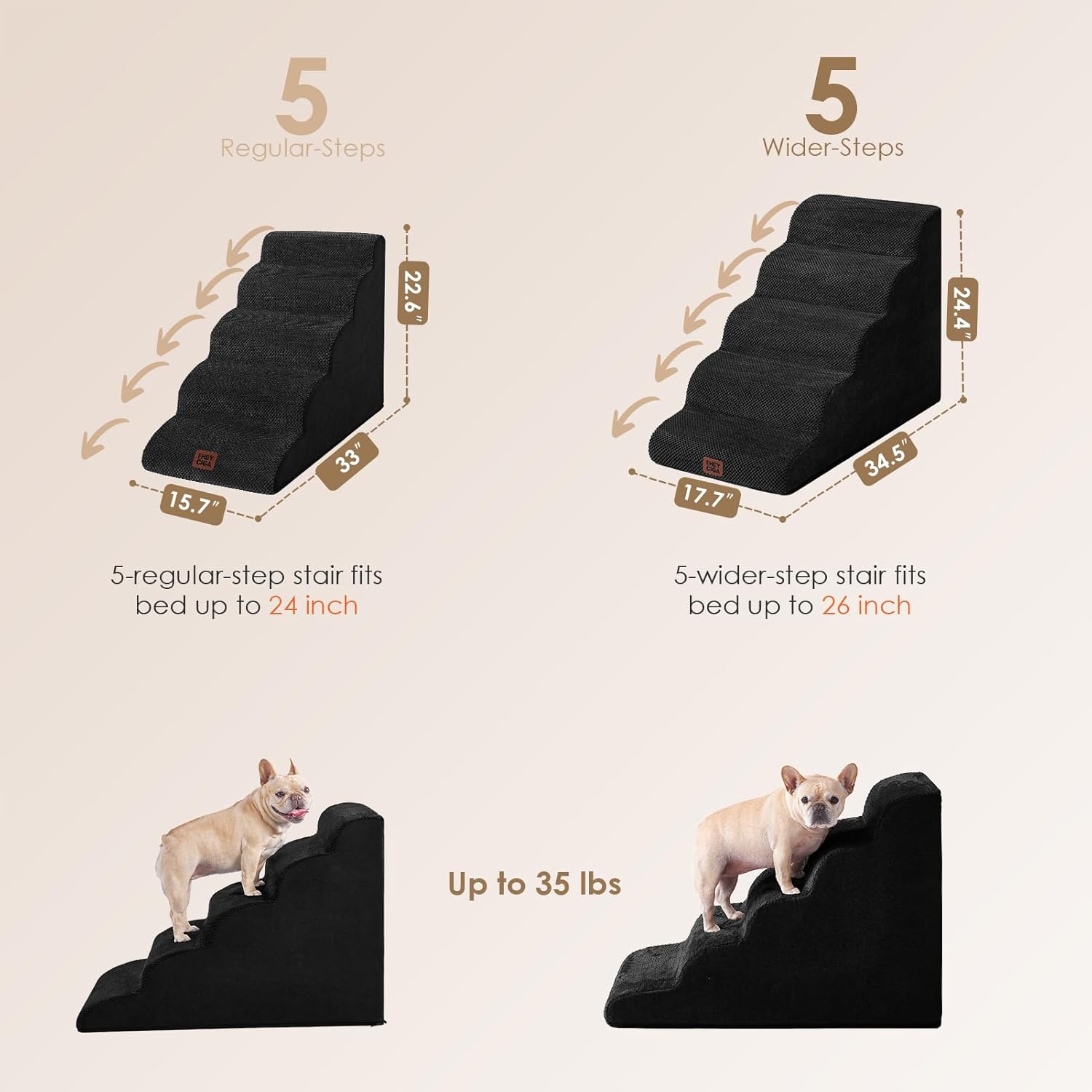 • MULTIPLE STEP SIZES - This dog stair has 2 steps, 3 steps, 4 steps and 5 steps to choose. Our 2-step stairs fits for chair/sofa/bed up to 13inch. 3-step stairs fits for chair/sofa/bed up to 17inch. 4-step stairs fits for chair/sofa/bed up to 21inch. And 5-step stairs fits for chair/sofa/bed up to 24inch.