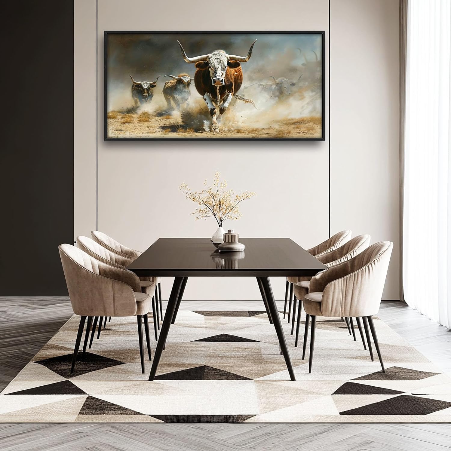 - 【Unique Design】An oil painting of longhorn cattle running through a dusty landscape, realistic and cinematic in style.