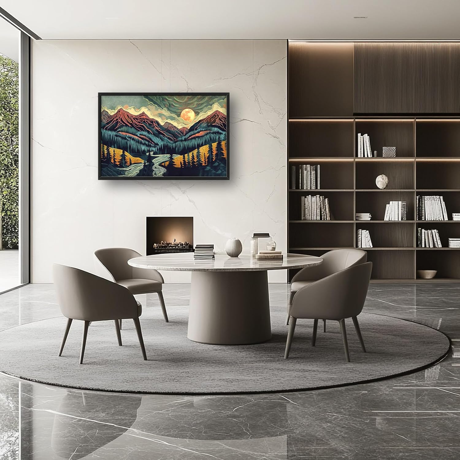 - 【Unique Design】A vintage-style illustrations of the Rocky Mountains, with pine trees and rivers flowing through them in the colors of the full moon. Mountains should be rendered in rugged detail against an atmospheric sky full of clouds. A river snakes between two rows of evergreen trees, adding depth to the scene. The emphasis in this work is on bold lines and flat face blocks. It has retro futuristic elements that give it an otherworldly character.