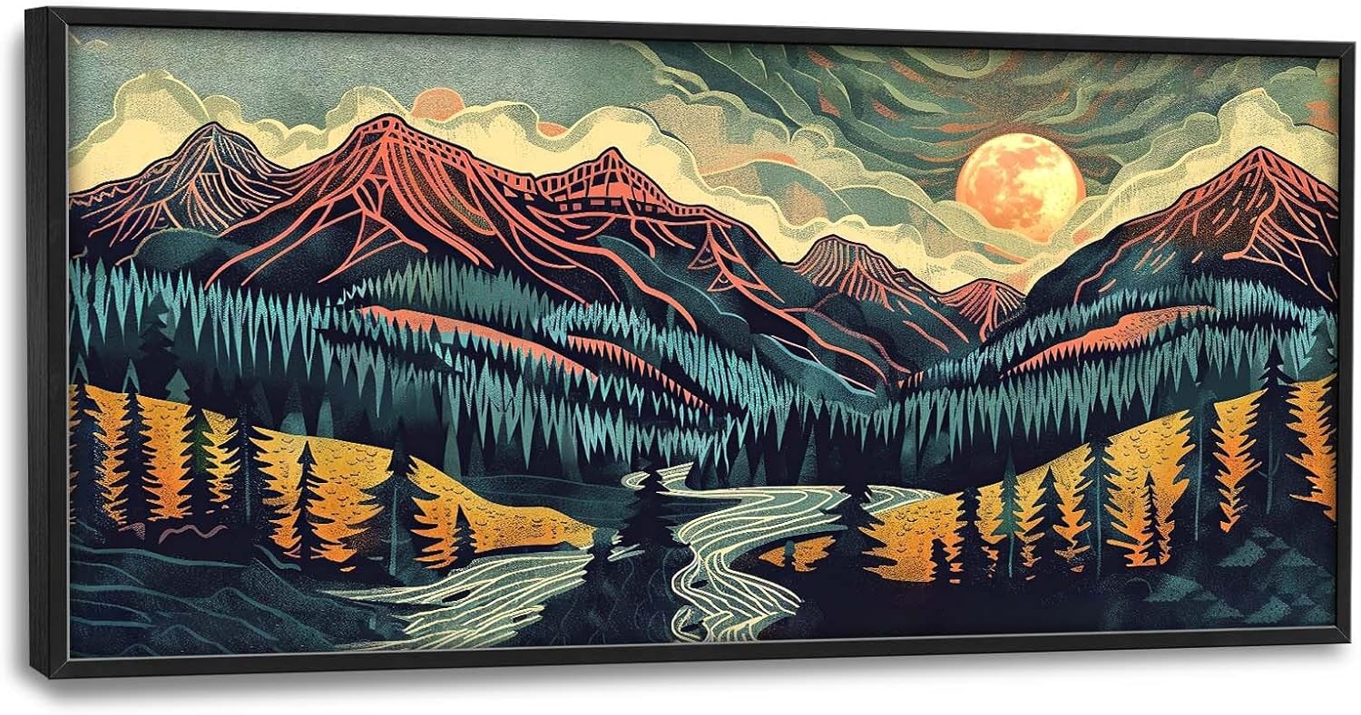 - 【Unique Design】A vintage-style illustrations of the Rocky Mountains, with pine trees and rivers flowing through them in the colors of the full moon. Mountains should be rendered in rugged detail against an atmospheric sky full of clouds. A river snakes between two rows of evergreen trees, adding depth to the scene. The emphasis in this work is on bold lines and flat face blocks. It has retro futuristic elements that give it an otherworldly character.