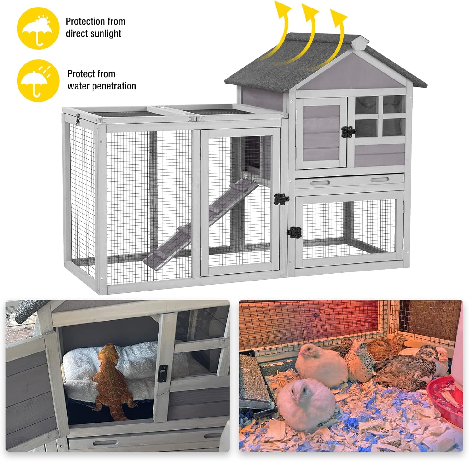 - 【Water Resistant Asphalt Roof & Cap】This rabbit cage features a durable,asphalt waterproof roof to protect your furry pet from the elements,and predator-resistant spring latch keeps your poultry safe.