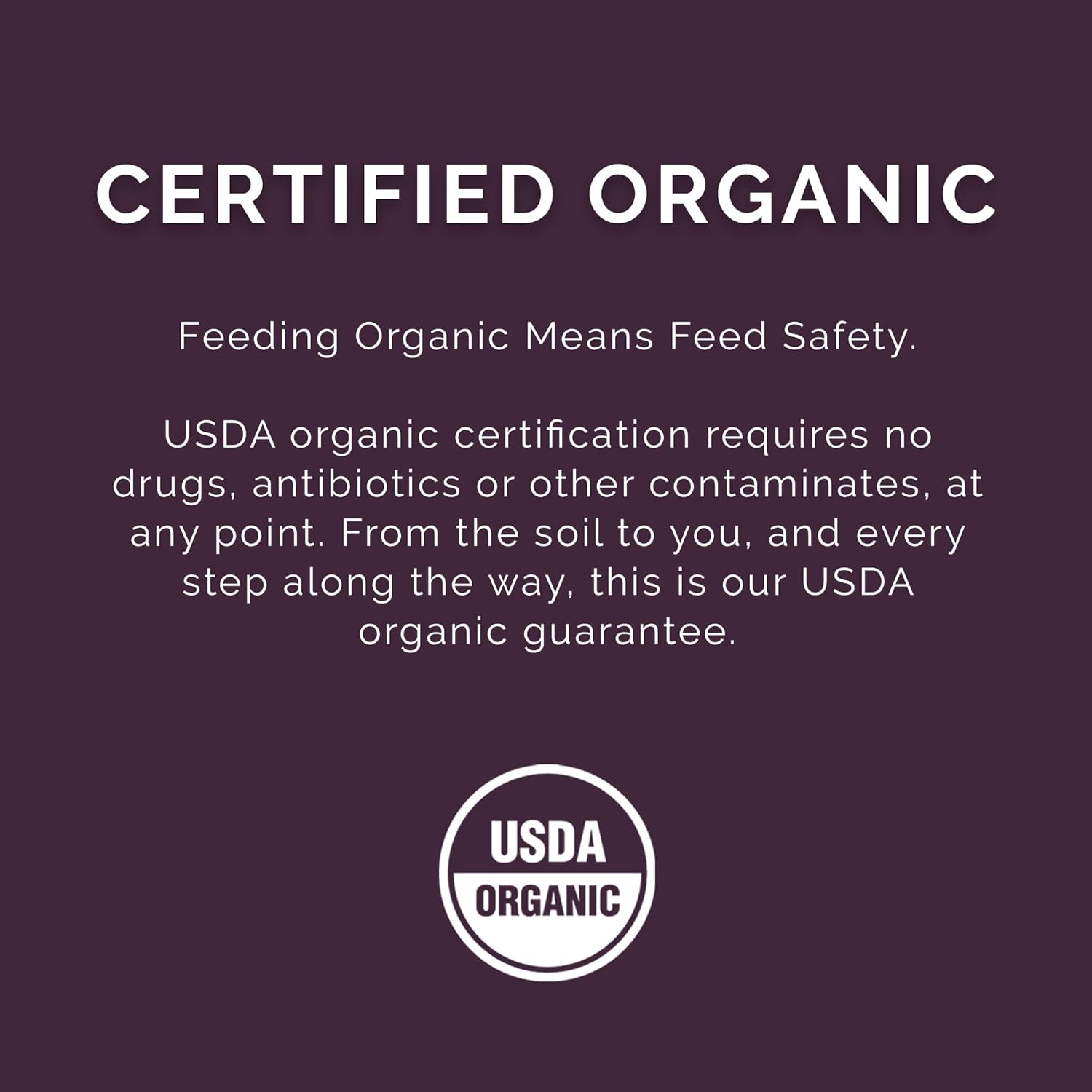 • Feeding Organic Means Feed Safety: USDA organic certification requires no drugs, antibiotics or other contaminates, at any point. From the soil to you, and every step along the way, this is our USDA organic guarantee.