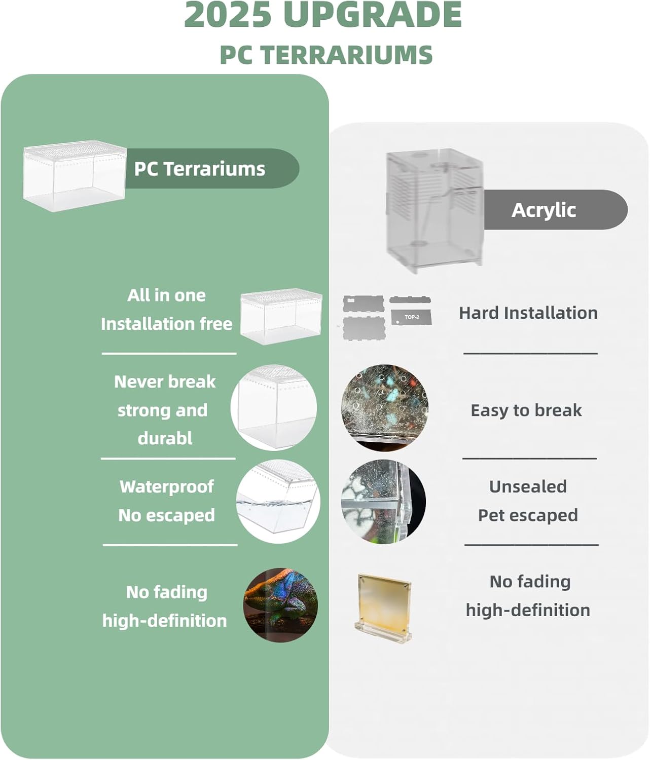 - 【360°Viewing Experience】:98% high-transparency PC resists yellowing over time, offering unobstructed views of your pets’ activities.—ideal for leopard gecko tanks, snake enclosures, or frog terrariums where every detail matters.