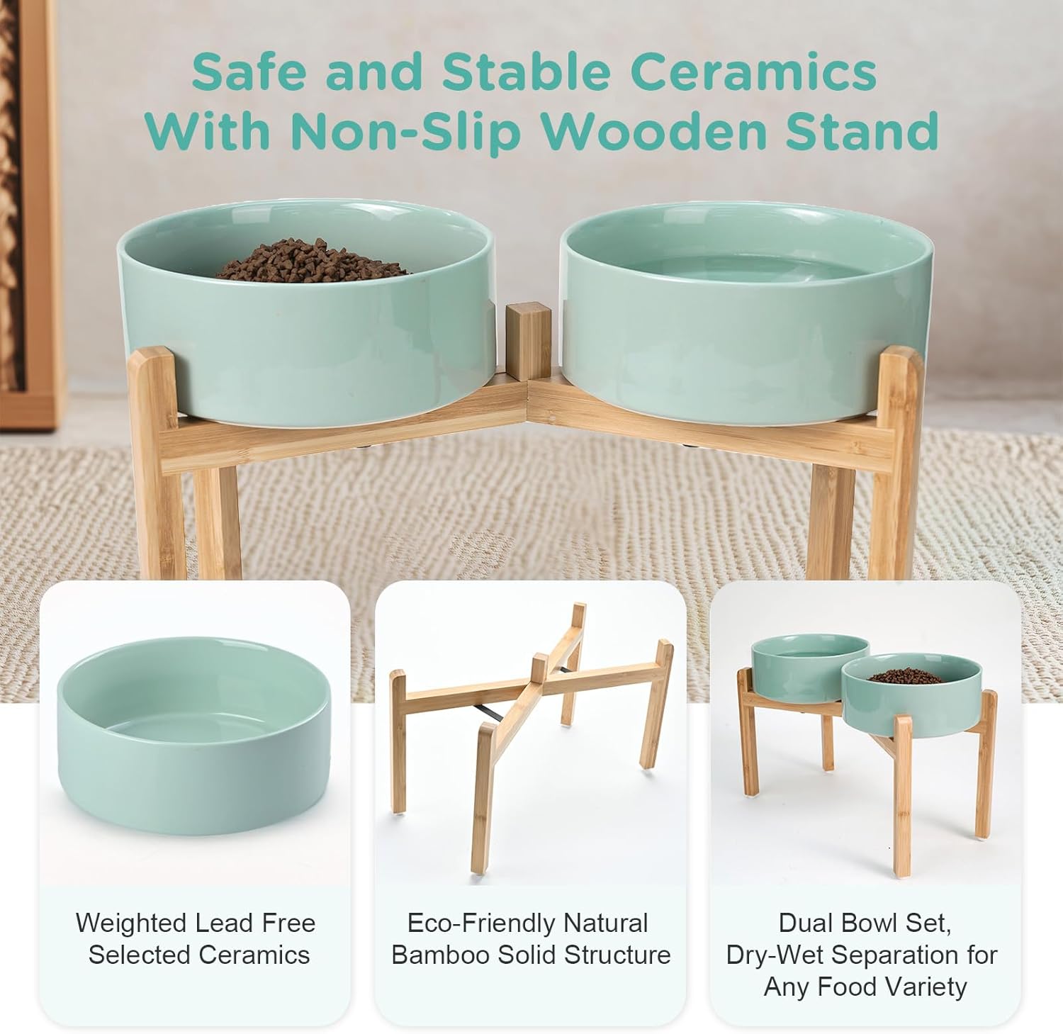 • Four Size Options to Match Any Breed – Choose 5.1" (13.5 oz), 6.1" (28.7 oz), 7.3" (42 oz), or 8.3" (60 oz) capacities with different height adjustable bamboo stand,to fit everything from kitten puppy, small to large sized breed dinners.The generous diameters and smooth ceramic surface handle everything from crunchy kibble and hearty wet food to broth‑soaked raw diets and occasional treats—the versatile pet bowls for every menu