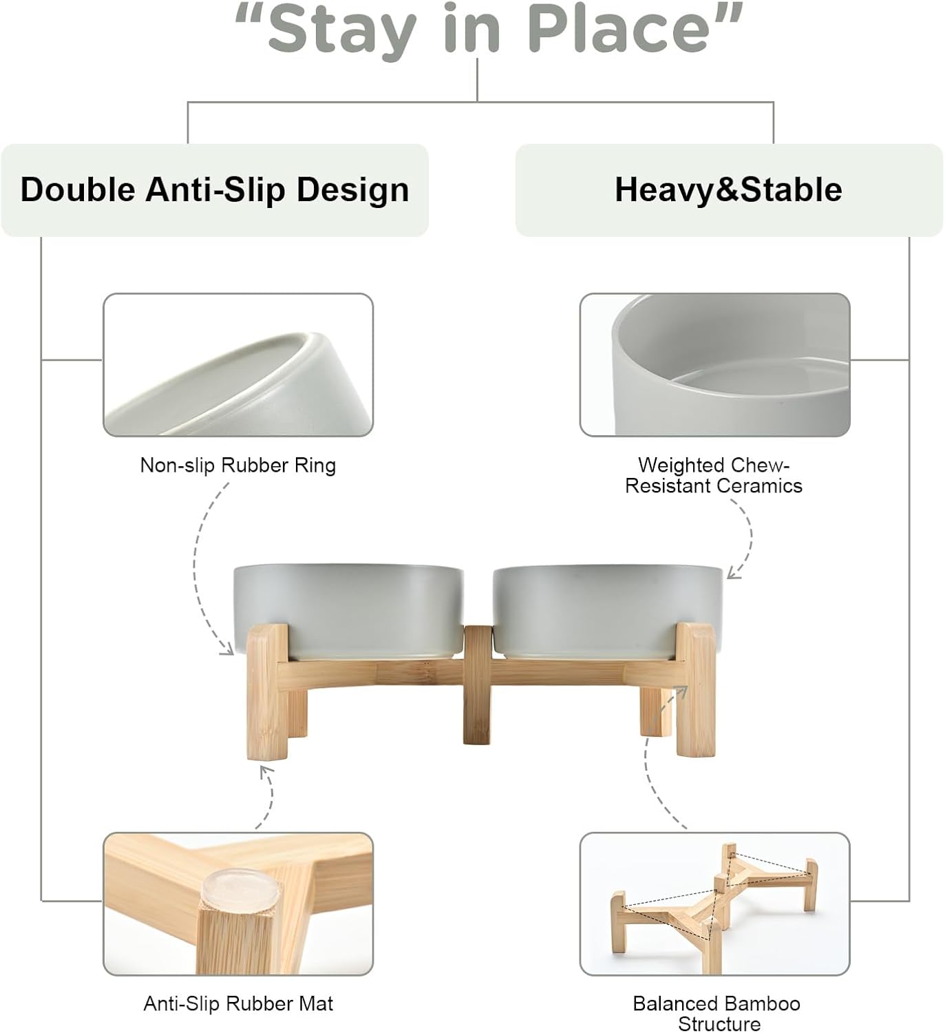 • Stable, Tip‑Resistant Design – A solid bamboo frame with Chew‑Resistant Heavyweight Ceramic, wide stance, and slip‑proof silicone pads join forces to create raised dog bowls that STAY IN PLACE on tile, wood, or laminate. Fewer spills mean cleaner floors and no accidental gouges or scratches or noisy