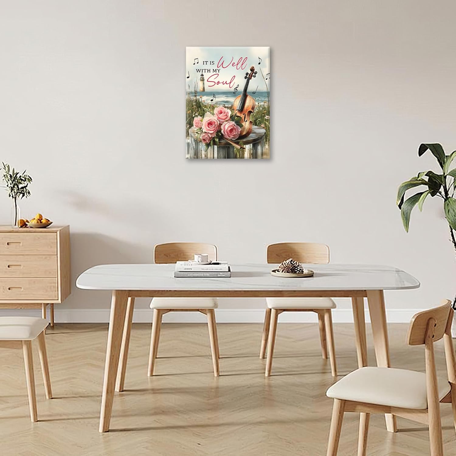 Violin Pictures Wall Art, Music Rustic Inspirational Bathroom Wall Decor, Coastal lighthouse Framed Painting Rose Aesthetics Canvas Artwork for Bathroom Bedroom Living Room Decorations 16"L x 12"W