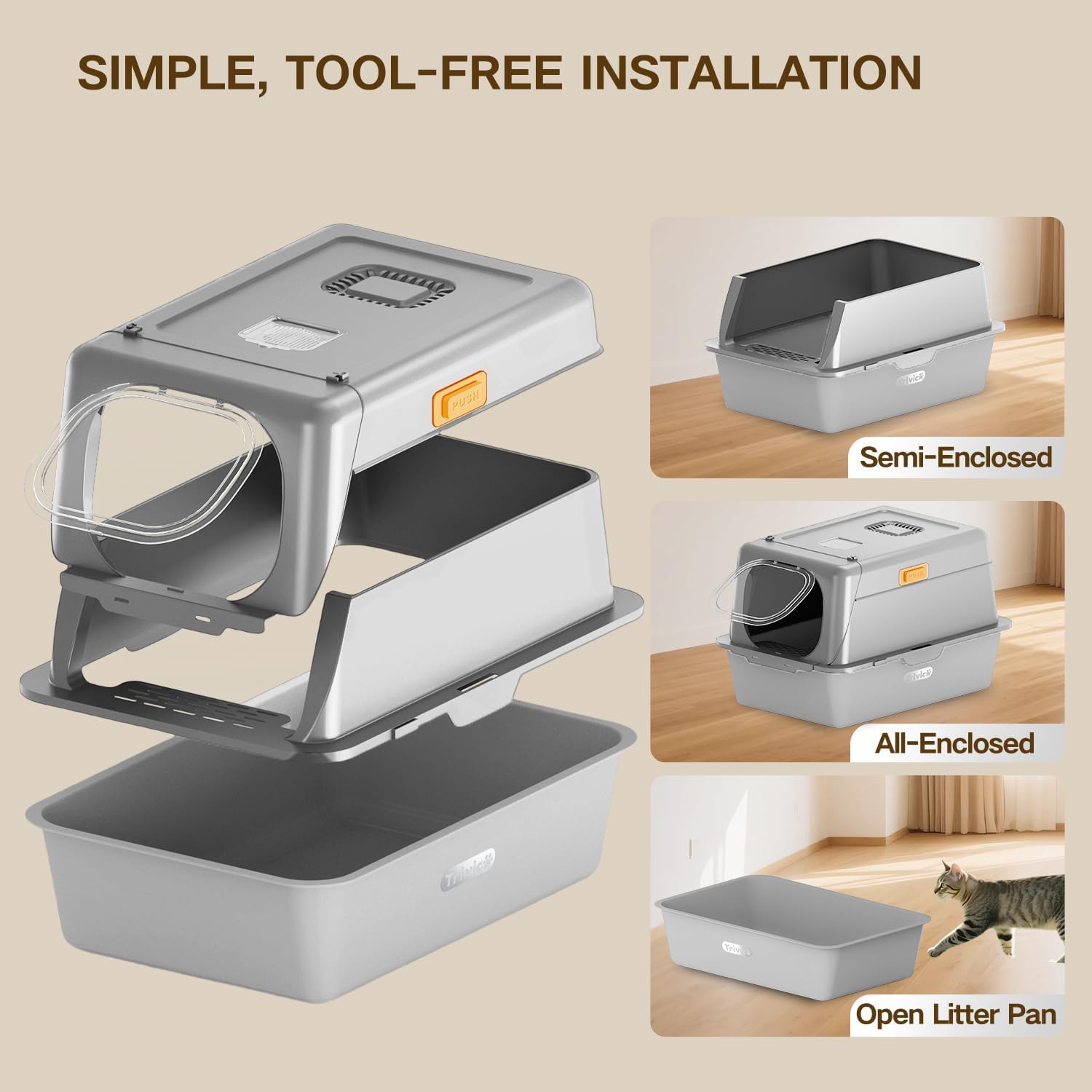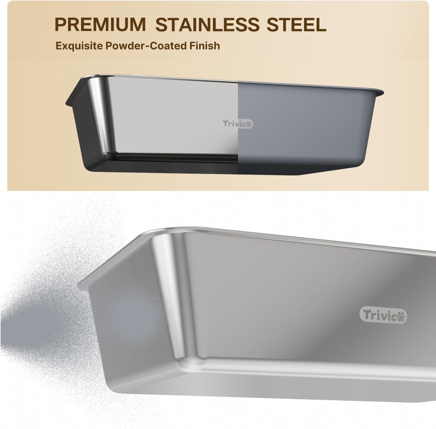 • Premium Stainless Steel Litter Pan(Exquisite Powder-Coated Finish). Unlike traditional plastic trays, this cat litter box features a high-quality stainless steel bottom with a durable powder-coated finish. It’s scratch-resistant, non-stick, and easy to clean—no more lingering odors or trapped litter clumps. Designed to stay cleaner for longer, offering both durability and hygiene for your feline friend.