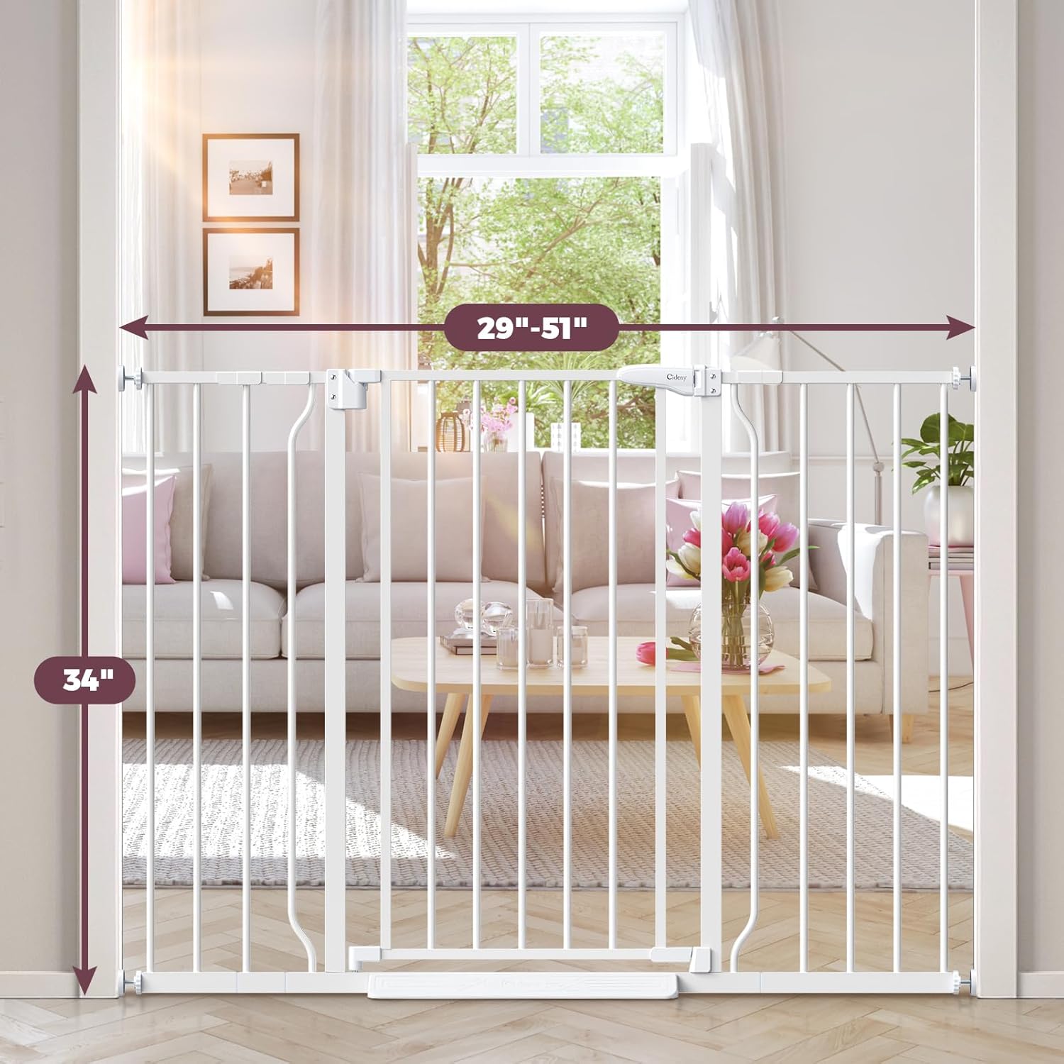 - Extra Tall & Extra Wide: This baby gate expands from 29" to 51" wide, creating secure barriers for oversized doorways, staircases, hallways, and other off-limit areas. It stands 34 inches tall, making it ideal for both curious toddlers and large pets