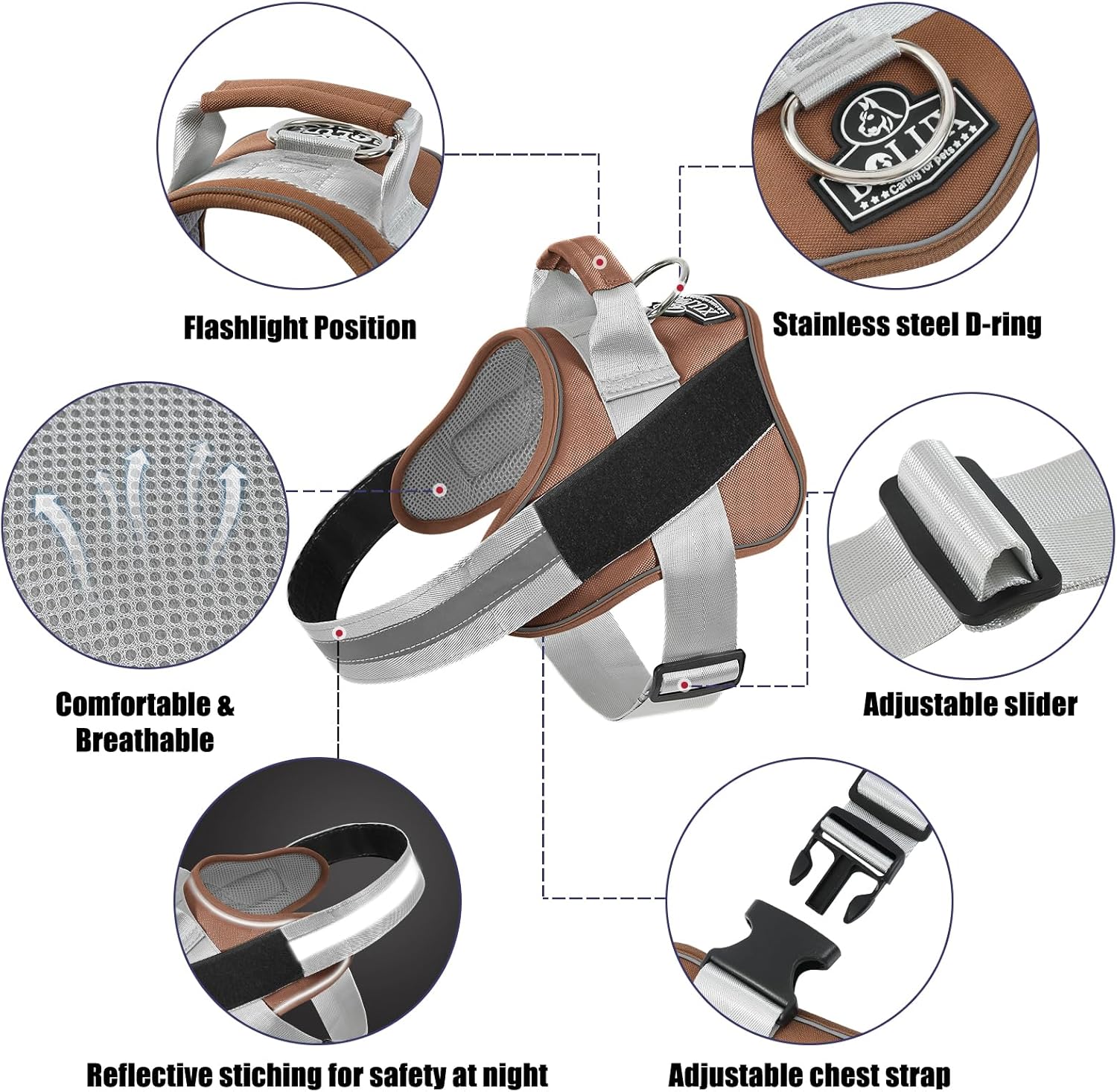 • OUTDOOR HEALTHY: Puppy no pull dog harness with reflective straps to ensure your dog is highly visible and keep dogs safe at night. You can connect the dog leash on the D-ring and with handle is easy to control on crowded streets. The high-end pet harness is perfect for daily walking, running, hiking, training, hunting, outdoor adventure and more!