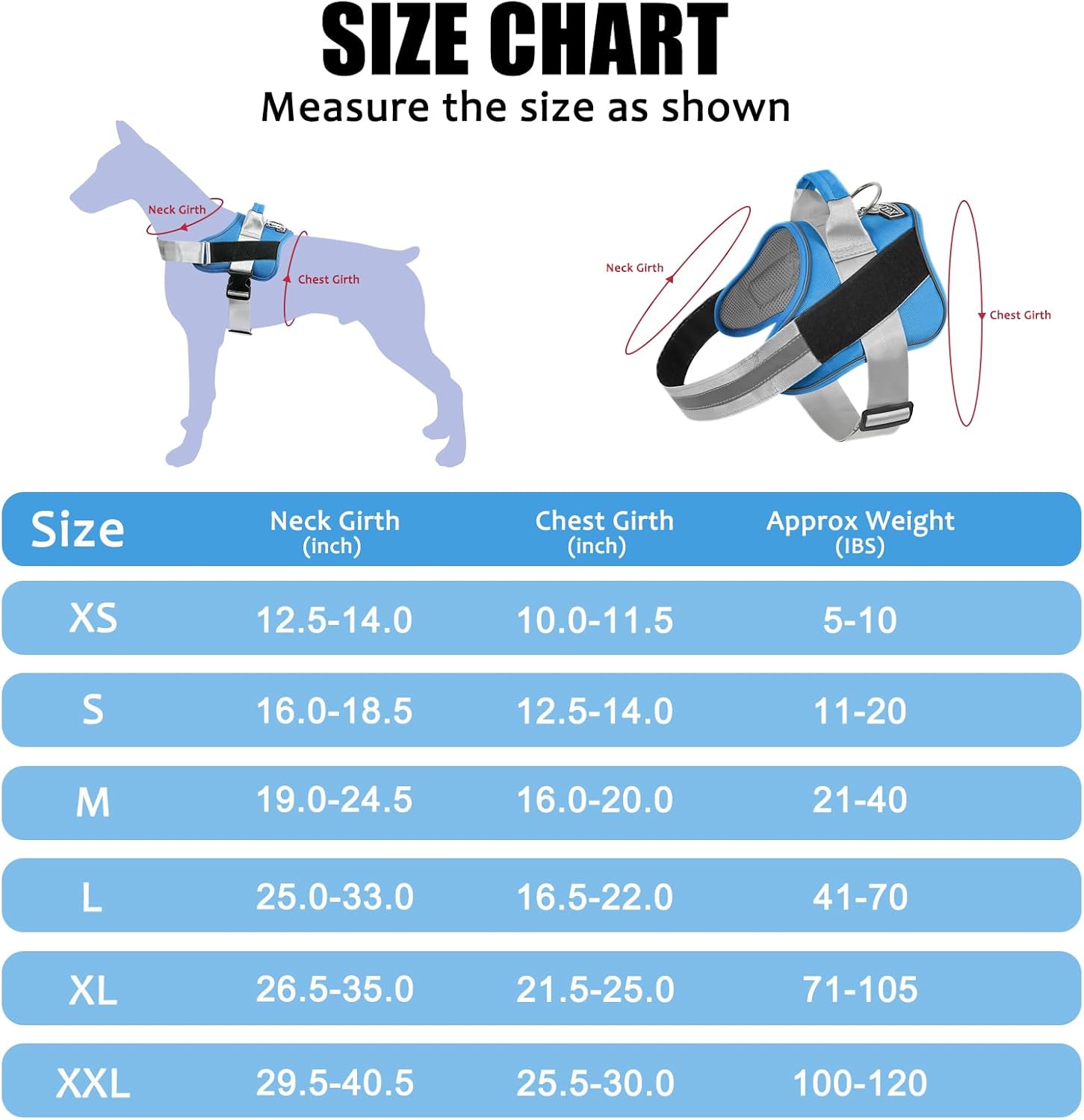 - EXTRA SMALL DOG HARNESS: ★Approx Weight: 5-10 lbs. Neck Girth: 10"-11.5", Chest Girth: 12.5"-19"★. It perfect for extra small dogs and pups, like Yorkie, Chihuahua, Pug, Maltese dog, etc.