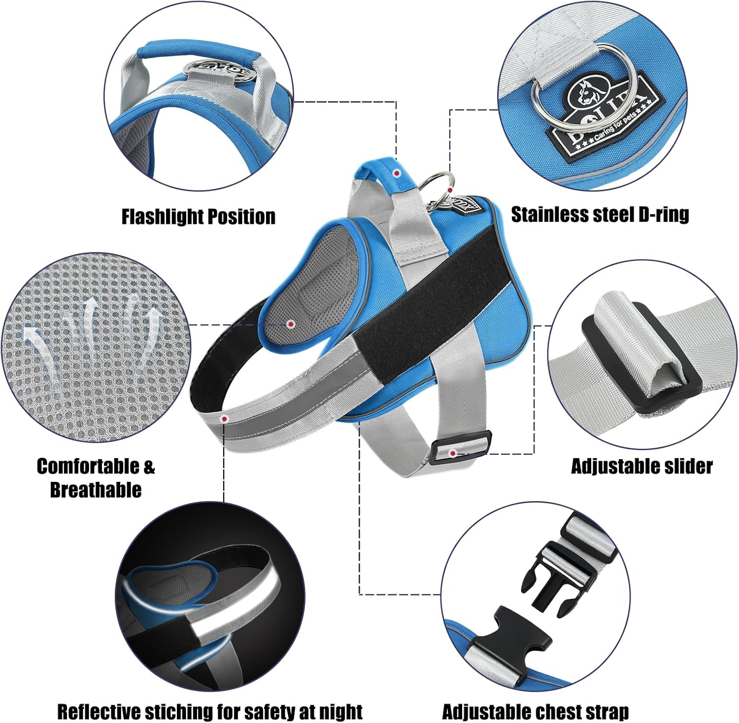 - STURDY HANDLE: The adjustable dog harness with rugged nylon handle further enhances your distance from the dog and is more intimate with each other. Easy on dog harness is also the best partner for dogs and is easy to control your dog.
