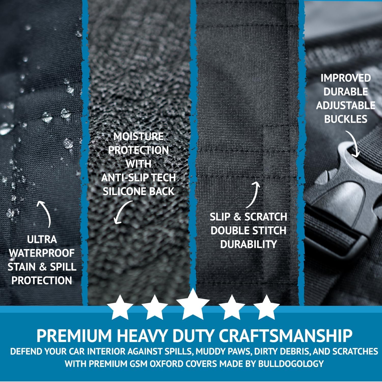 • Trunk Cover Protector: Defend your cargo and trunk area against dog hair, muddy paws, dirty debris, spills, stains, scratches, groceries, heavy equipment, beach sand, and other unwanted accidents. Bulldogology cargo liner for SUV includes full side protectors, zippers, mesh window, 60/40 option, and extra thick layers for all-around protection. Regardless of what your pet may put it through, our dog car seat covers are crafted with premium 600D GSM Oxford Material that Guarantees Satisfaction
