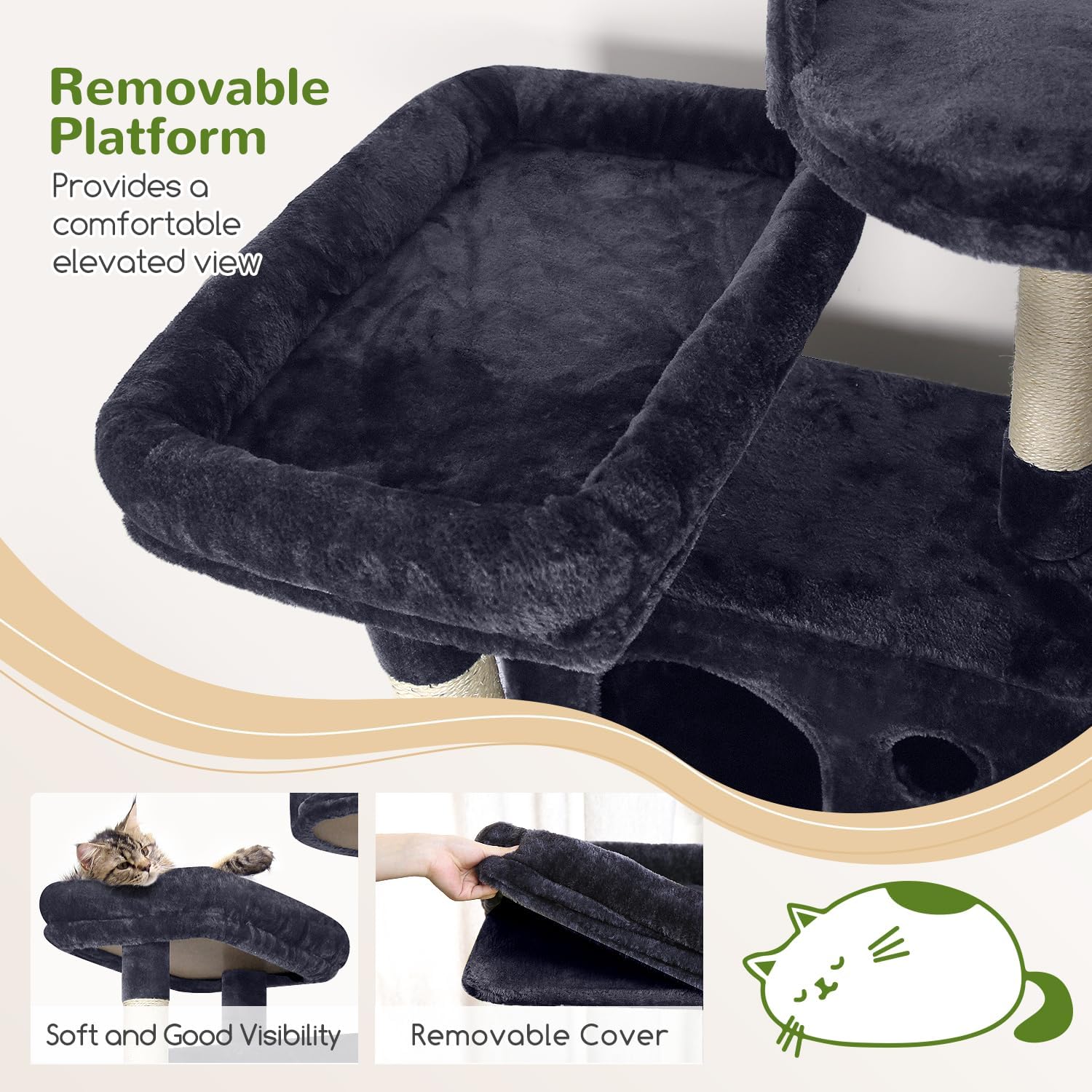 - MULTIPLE RESTING PLACES: Our tall cat tree features a enlarge platform (11.8” x 17.7”), a high point top perch and two spacious cozy cat caves, making it an excellent choice for multi-cat households. Provide ample space and multiple activity areas, allowing each cat to find its own cozy corner and enjoy the fun of playing together
