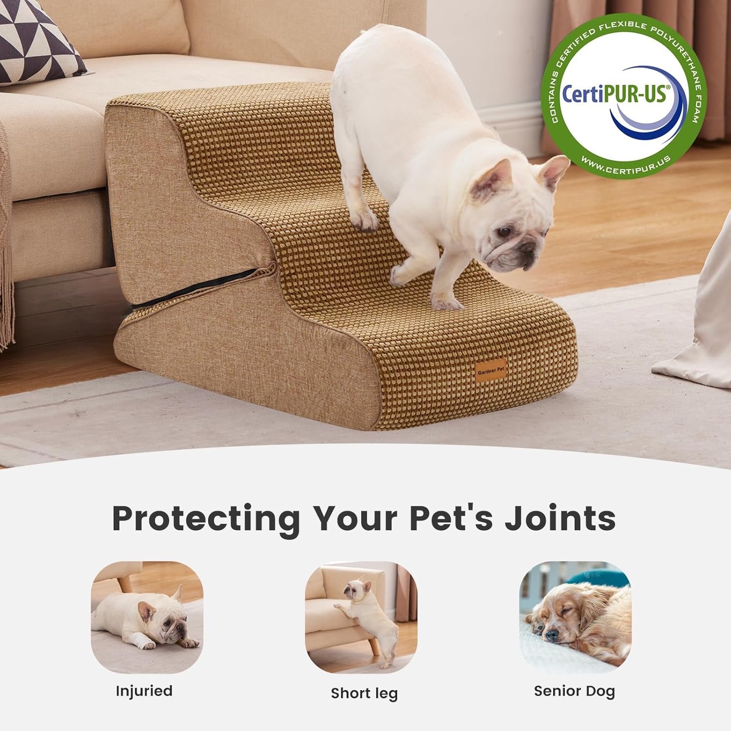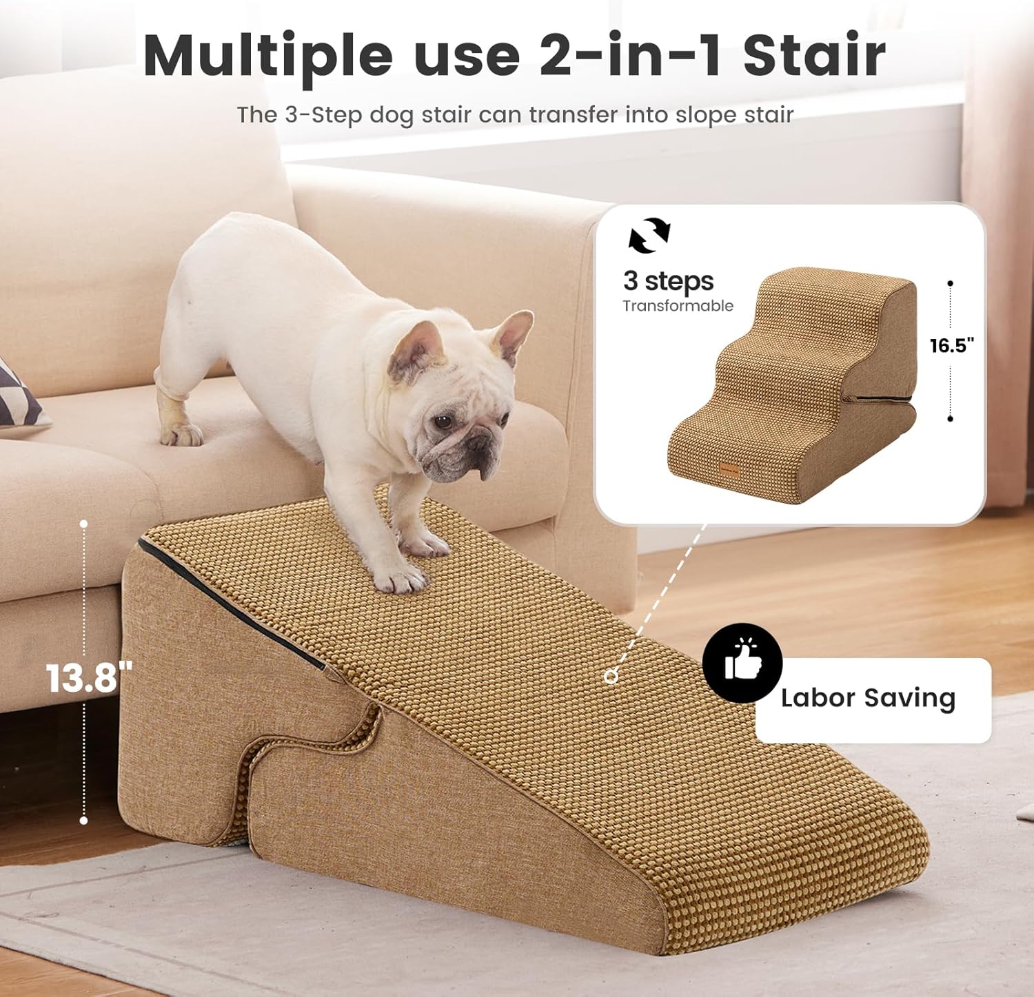 Gardner Pet Dog Stairs for Small Dogs 16.5" H, 2 in 1 Transformable 3-Step Pet Stairs and Dog Ramp for Couch (13-20 in), Brown Adjustable Pet Steps with Non-Slip Waterproof Cover and CertiPUR-US Foam