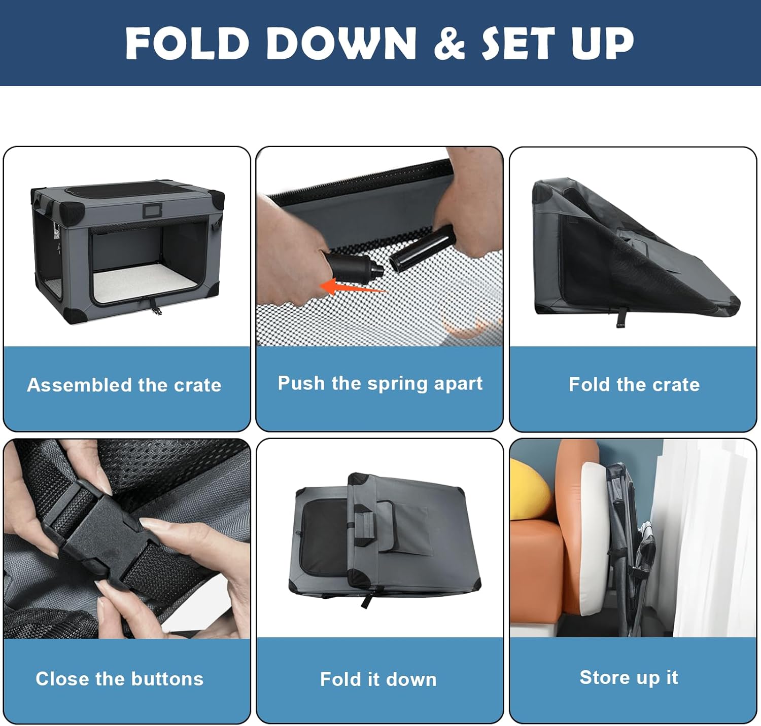 - 【Quick Assembly, Convenient Storage】No tools required, follow the instructions to complete the assembly in a few minutes, time-saving and convenient. Pockets on the side of the crate can store dog food, toys and other items, convenient for you to access at any time, making your pet's life more comfortable