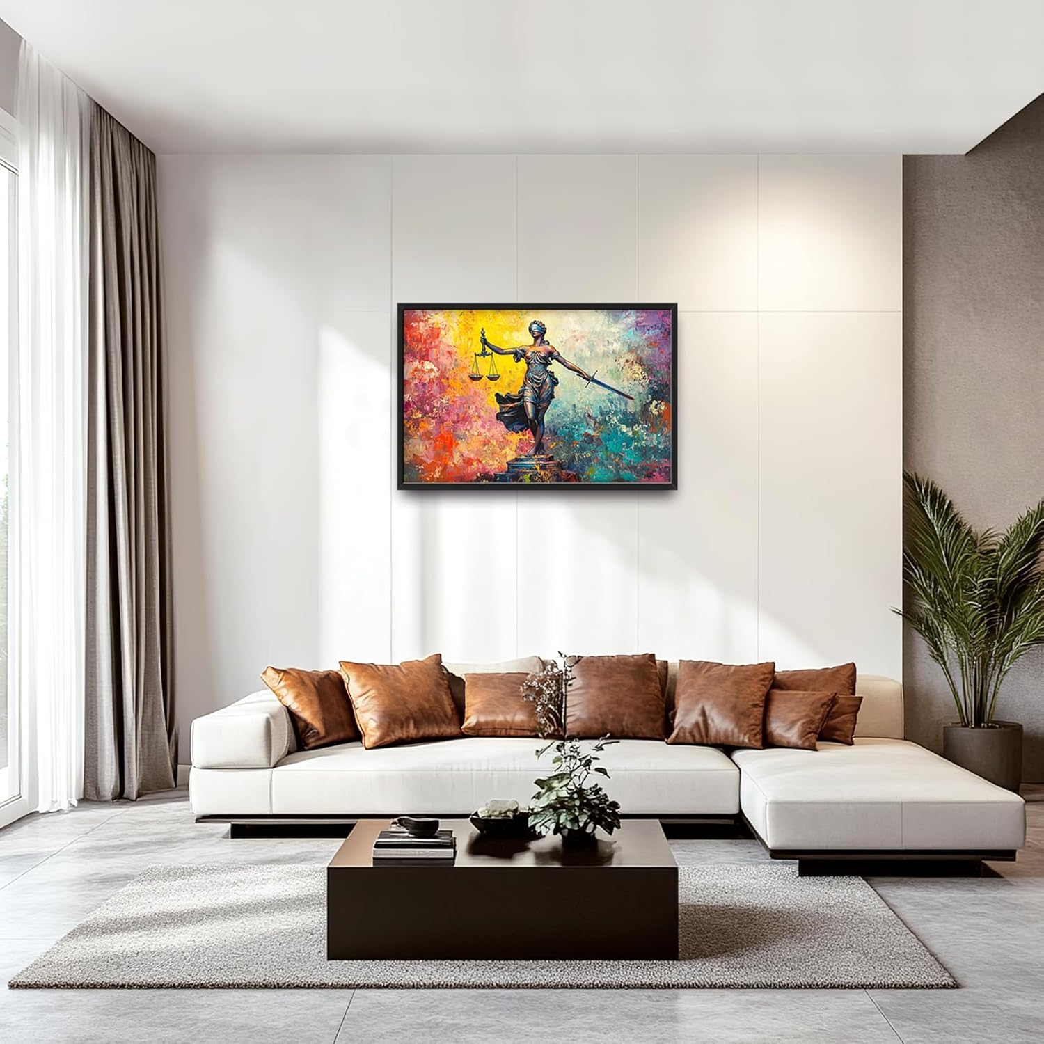 - 【Unique Design】 The painting depicts the Statue of Lady Justice holding a sword and scales in front, with bright, vibrant colors in an oil-on-canvas composition and a colorful background.