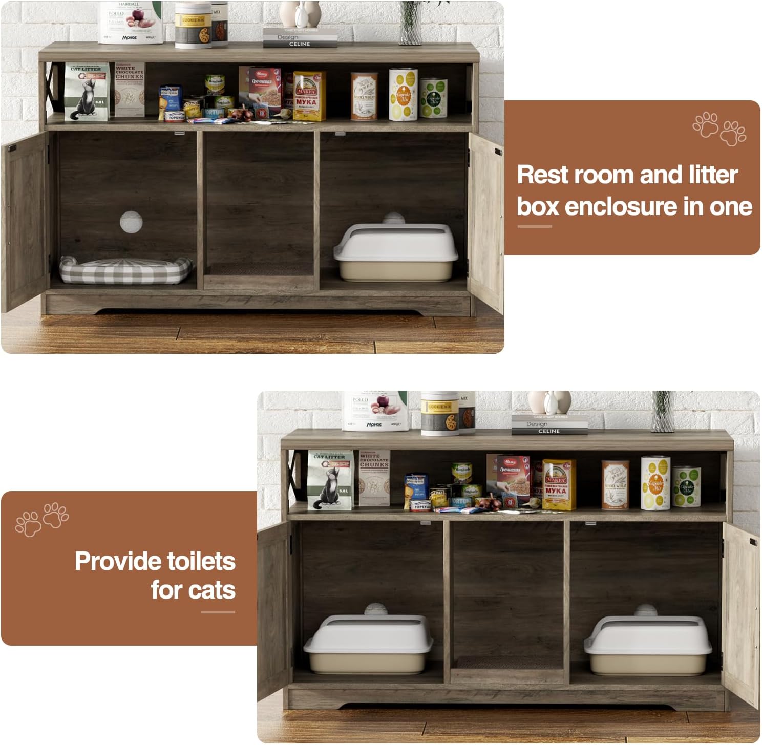 - Double Cabinet for 2 Cats: The 2 cabinets hold litter boxes or cat beds for 2 cats. Or both for one cat: one side for a litter box, the other for a cat bed. Our multi-functional cat box enclosure is designed with a spacious countertop and open storage compartment, perfect for storing pet food, toys and home decor.