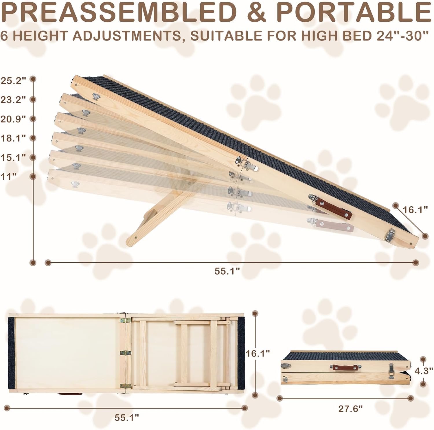 Folding Dog Ramp Safety, Wooden Adjustable Height Pet Ramps, Potable Dog Steps with Non-Slip Traction Mat, Dog Step for Bed, Dogs Stairs for SUV Car, Couch, Safe,Height Bed