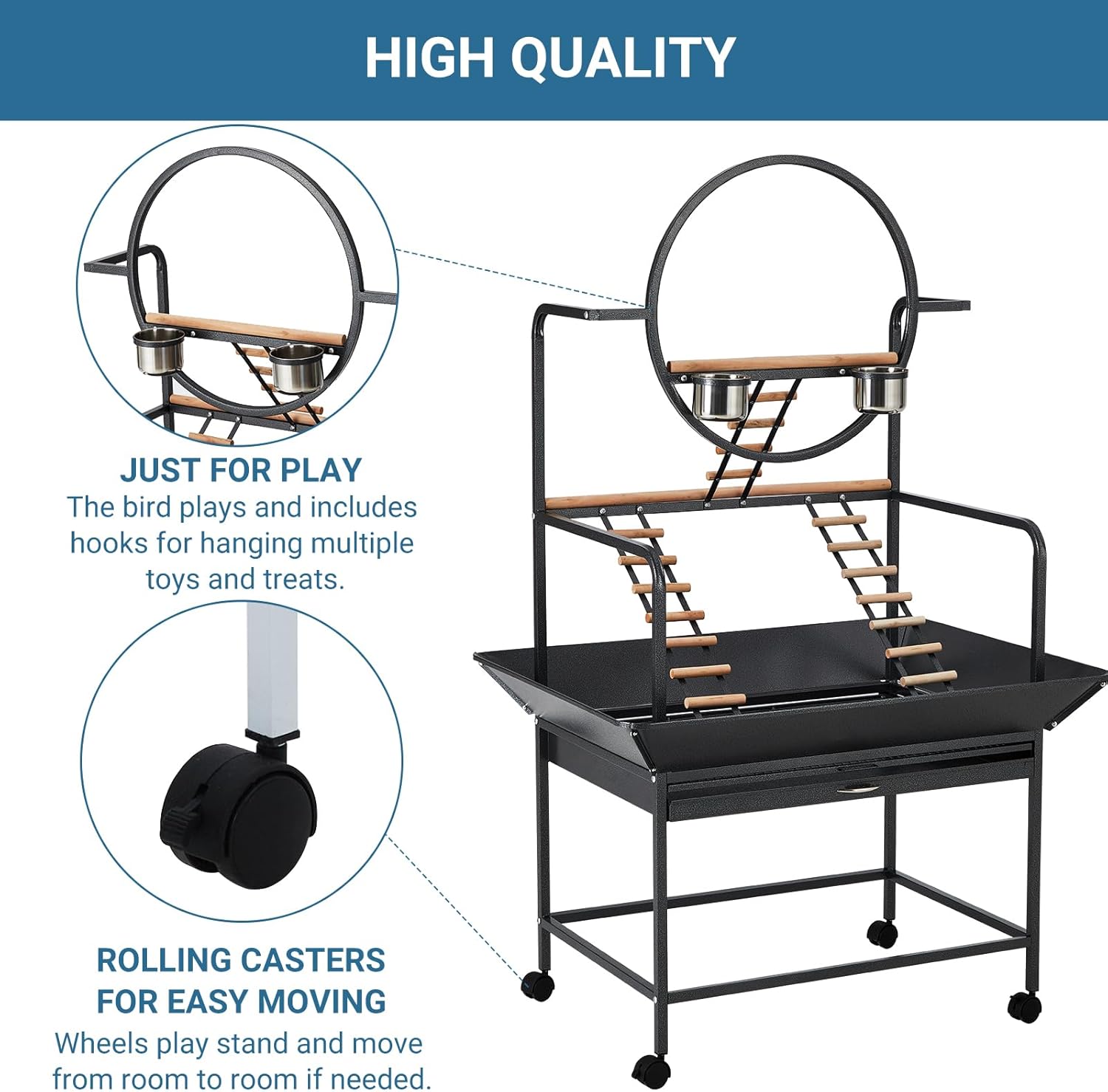 - Premium Construction - Crafted with heavy-duty metal and black hammertone finish, our parrot play gym withstands vigorous play. Includes dual stainless steel cups for food/water and removable seed guard. The pull-out debris tray simplifies cleaning.
