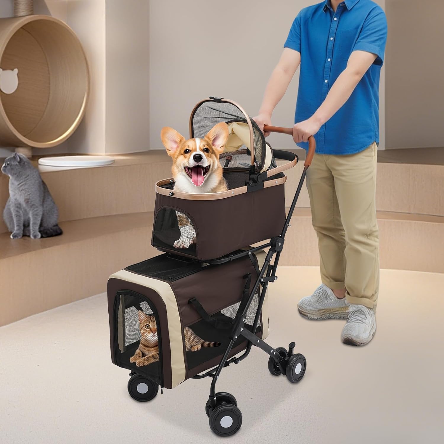 Double Pet Stroller for Dogs and Cats, Foldable Dog Stroller Travel Carriage with Detachable Carriers, Safety Belts, and 4 Lockable Wheels for Small to Medium Pets (Coffee Color)
