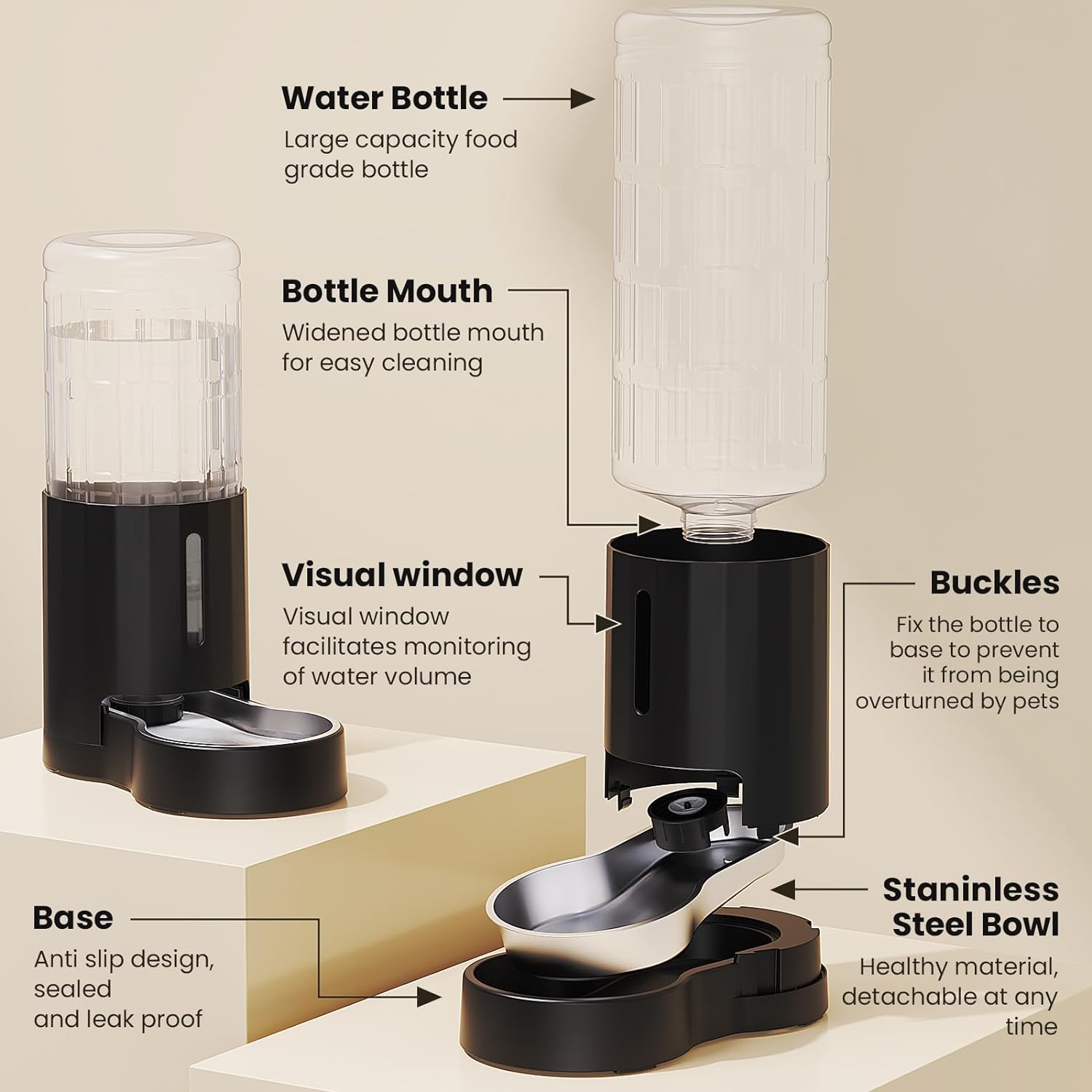 - [Drinking Safe] We take care of pets' drinking water health. The water bowl is fully attached to the base and made of food grade 304 stainless steel. Other components also use pet friendly materials.