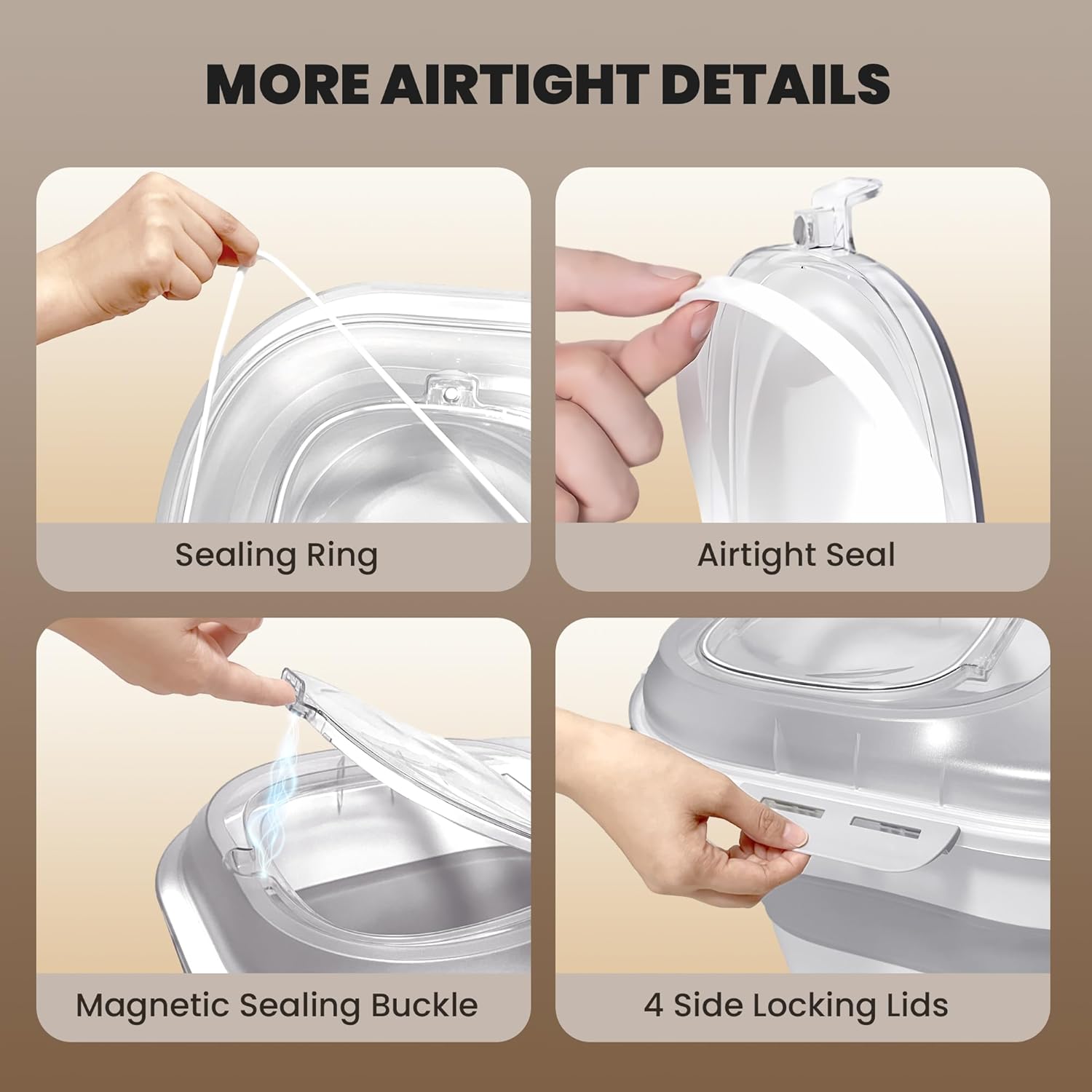 - Date Track: Upgrade design! We add timer in this dog food storage bin, you can exactlymark the time of the first pet food spill by sliding the time indicator (Date/Month),which can keep your pet safe from expired food.Superior Sealing for Freshness: Our dog food storage bin is designed with a doubleairtight seal and 4 secured latches, ensures your pet's food stays fresh longer, free frommoisture.
