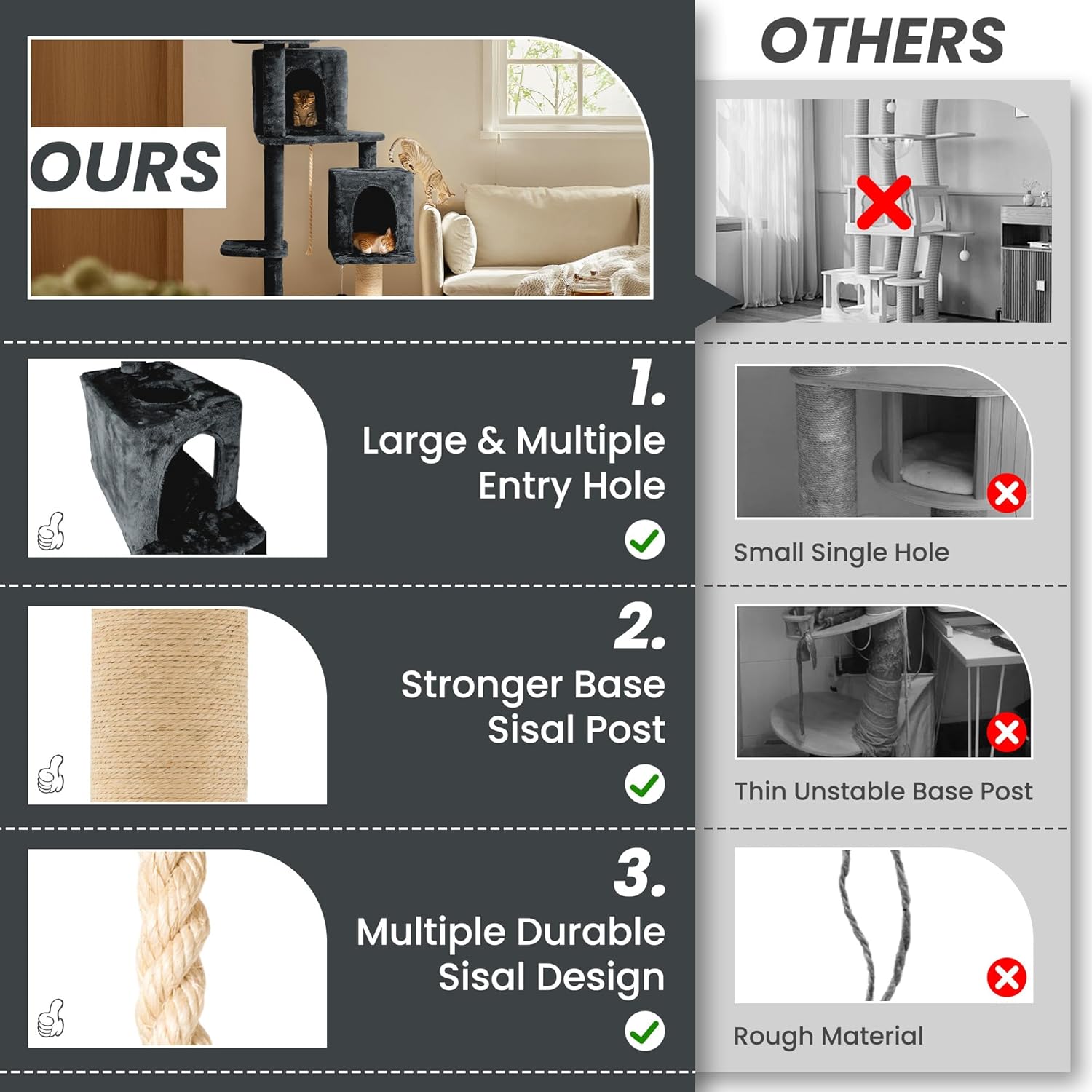 - š¾[Spacious and comfortable Design]: 59 inch ultra large size cat tree, equipped with two independent cat condos, providing ample space for multiple cats to move and rest.