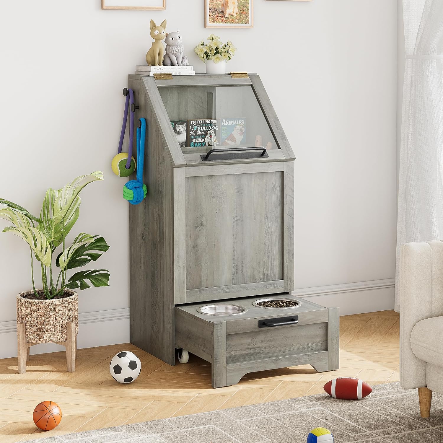 Dog Feeding Station with Storage - Large Capacity Dog Food Storage Cabinet with 2 Removable Stainless Steel Bowls, Flip Top Pet Food Container Toy Storage Organizer - Grey