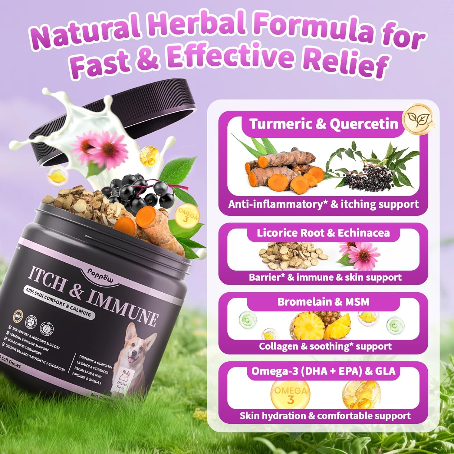 Dog Allergy Relief Chews, Itch Relief for Dogs – Turmeric & Omega-3 Supplements for Skin Comfort, Coat Health & Seasonal Support, Immune Care with Biotin & Quercetin – Chicken Flavor, 90 Count