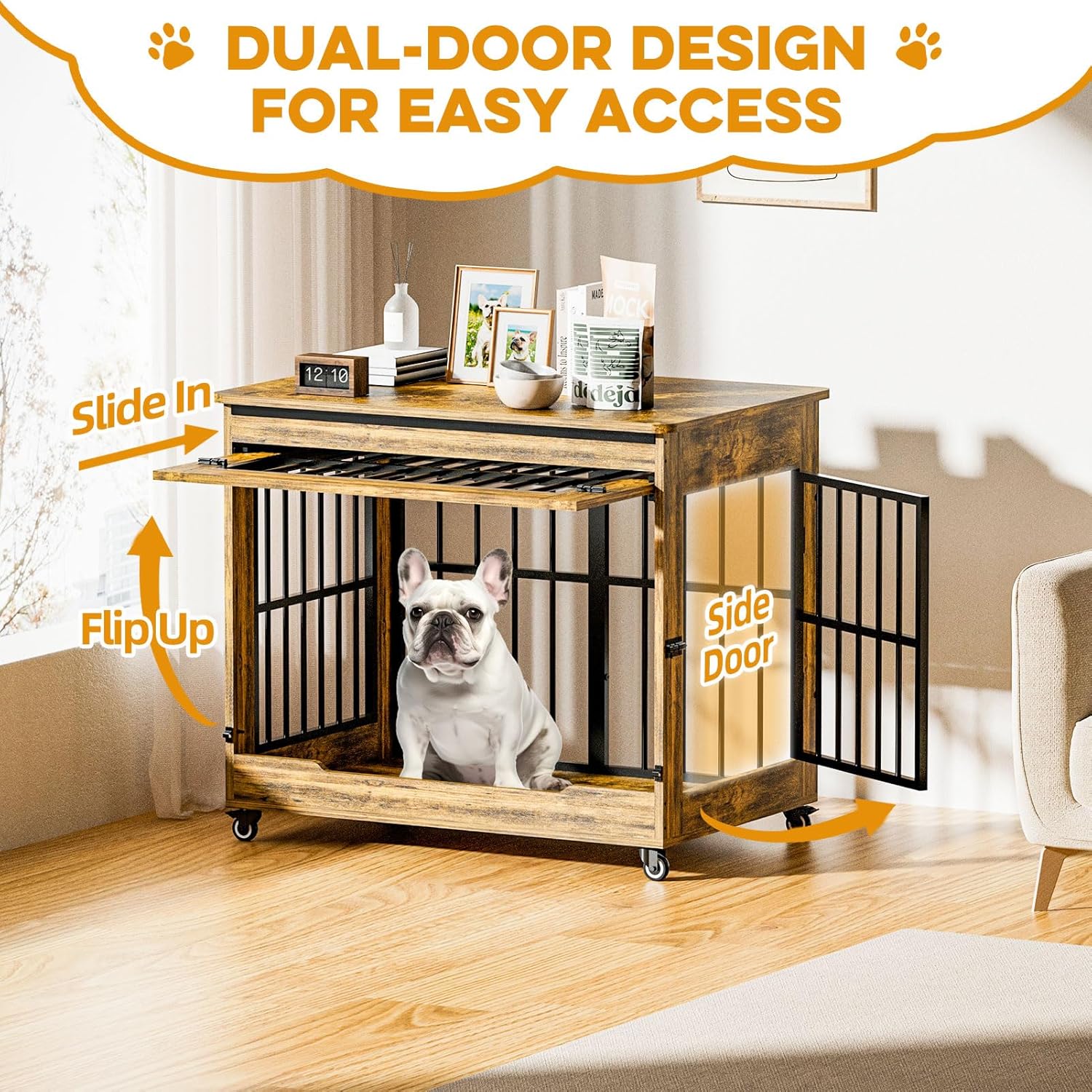 - Space-Saving Double Door: Features an innovative "lift-and-push" front door that opens upward, saving space and preventing accidents. Double door design offers easy access for cleaning, placing beds, or helping your pet in and out