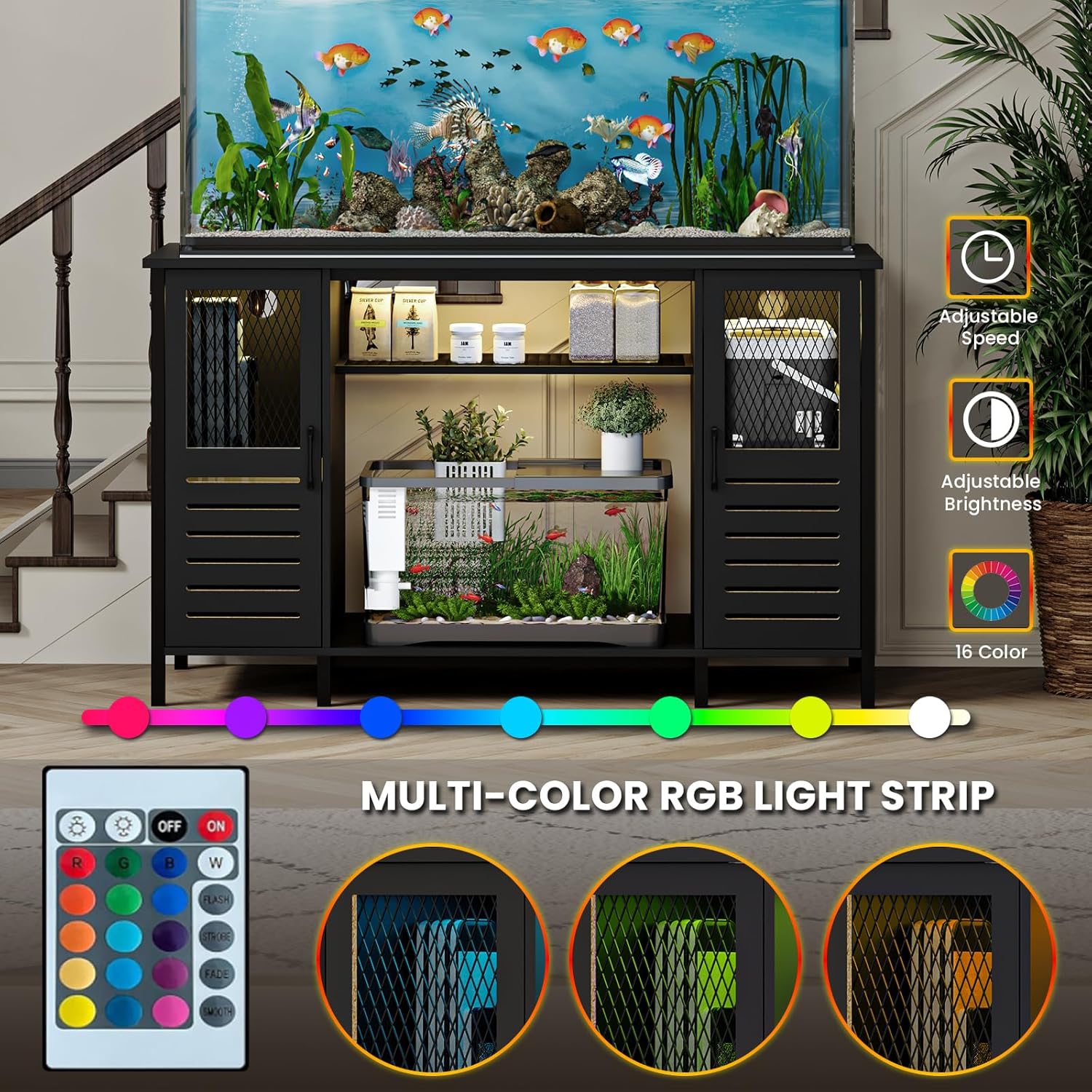 EAG 55-75 Gallon Fish Tank Stand with Power Outlets & LED Light, Heavy Duty Aquarium Stand with Adjustable Shelves, Turtle Reptile Terrarium Tank Stand with Cabinet, 1250LBS Capacity, Black